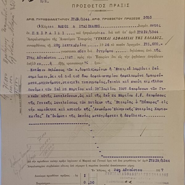 Λιθόγραφα έντυπα “Caledonian Insurance Company” & “Γενικαί Ασφάλειαι της Ελλάδος” 1927 από την Αθήνα (LOT 2 τεμαχίων)