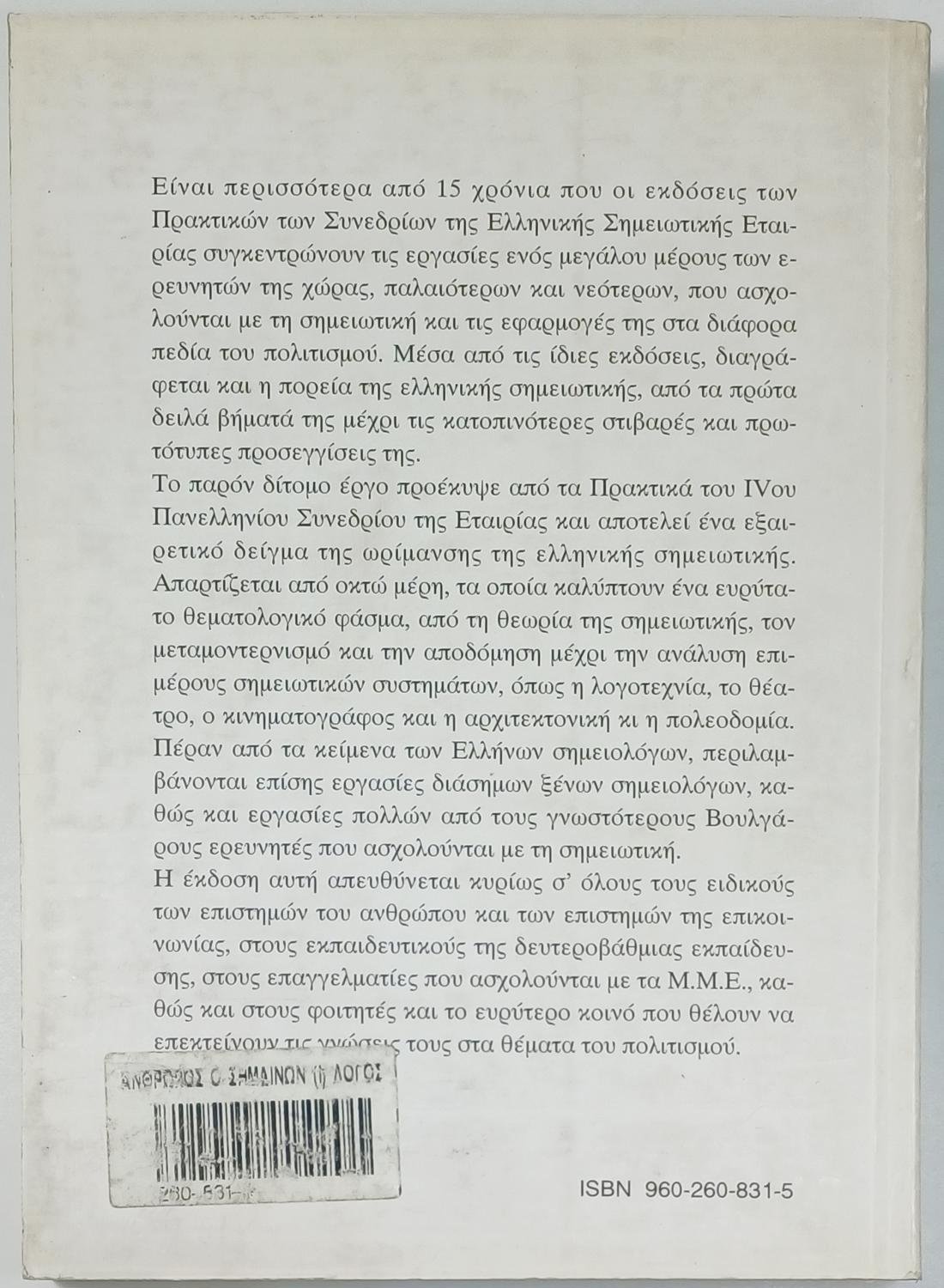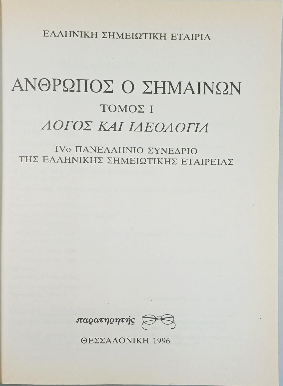 Το βιβλίο «Άνθρωπος ο σημαίνων, Τόμος Ι: Λόγος και ιδεολογία» αποτελεί τα πρακτικά του 4ου Πανελλήνιου Συνεδρίου της Ελληνικής Σημειωτικής Εταιρείας. Αυτός ο τόμος, ο πρώτος από δύο, εξετάζει τη σημειολογία του λόγου και της ιδεολογίας στο πλαίσιο των θεμάτων σημειολογίας και πολιτισμού. Περιλαμβάνει μια συλλογή κειμένων και ομιλιών που αναλύουν πώς η σημειολογία διαμορφώνει και επηρεάζει τις ιδεολογικές δομές στην κοινωνία και τον πολιτισμό.