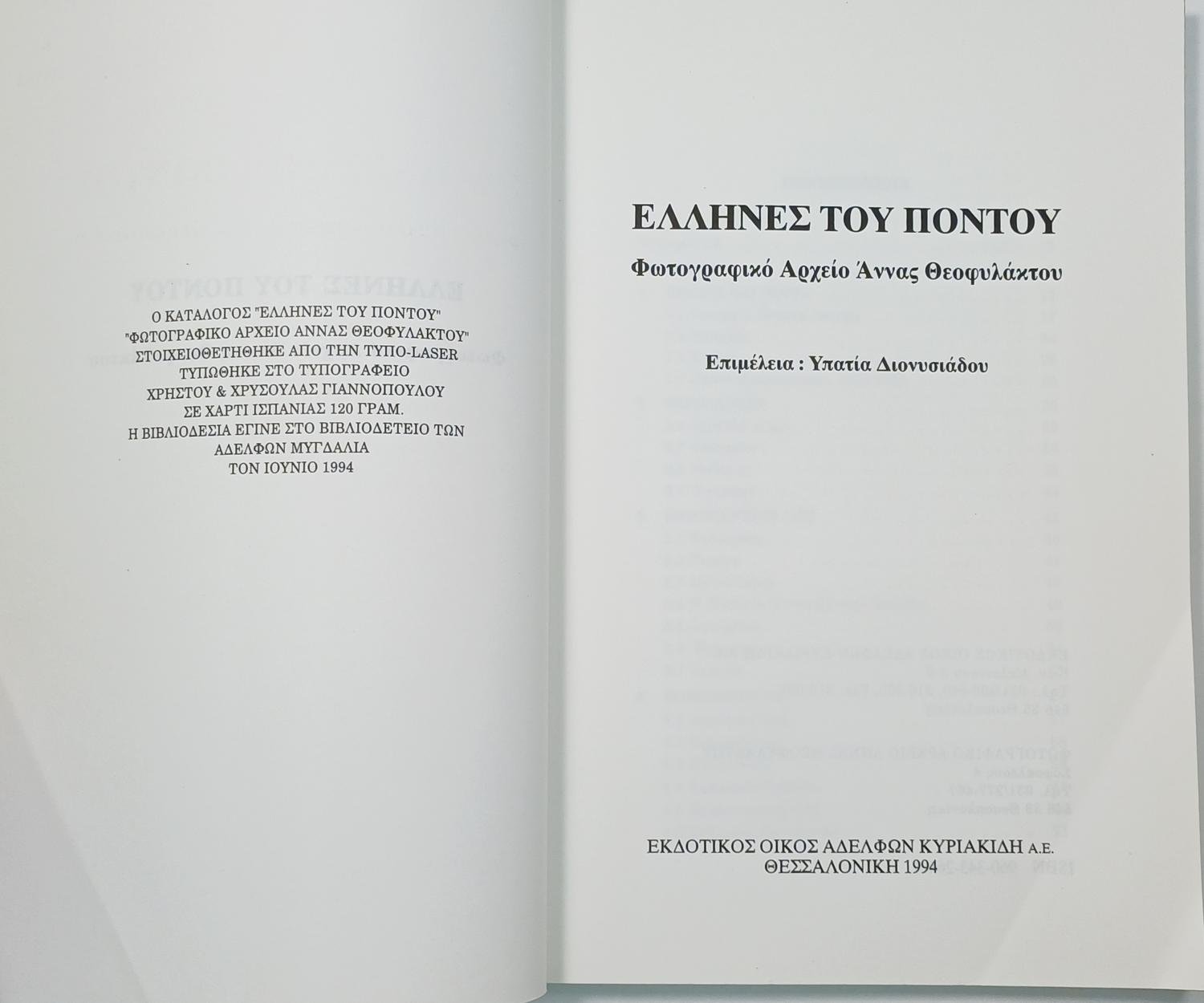 Το δυσεύρετο βιβλίο “Έλληνες του Πόντου: Φωτογραφικό Αρχείο Άννας Θεοφυλάκτου” αποτελεί μέρος του πλούσιου οπτικού υλικού από το προσωπικό αρχείο της Άννας Θεοφυλάκτου, μιας σημαντικής προσωπικότητας του Ποντιακού Ελληνισμού. Η έκδοση αυτή, αναδεικνύει μέσα από σπάνιες φωτογραφίες πτυχές της ιστορίας και του πολιτισμού των Ελλήνων του Πόντου, καλύπτοντας την περίοδο πριν από τη Μικρασιατική Καταστροφή και τον ξεριζωμό, καθώς και τη διατήρηση της εθνικής τους ταυτότητας.