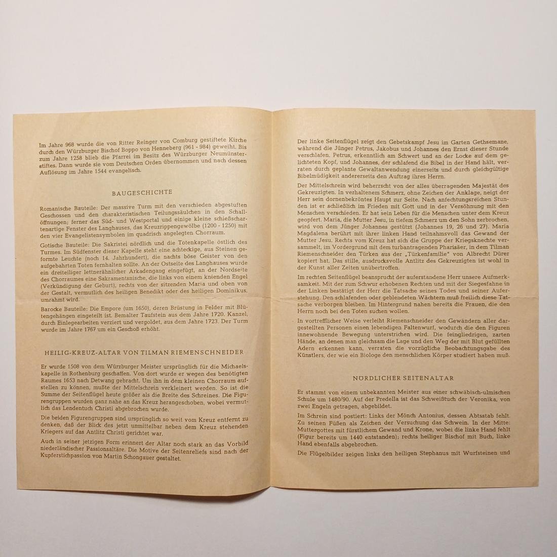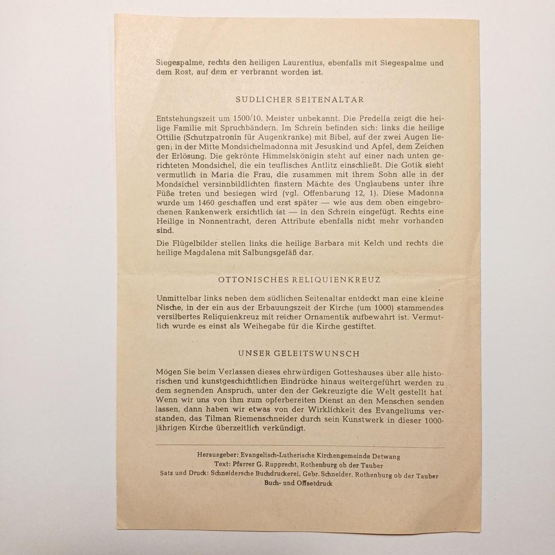 Έντυπο του 20ού αιώνα, “Η Εκκλησία των Αγίων Πέτρου και Παύλου (St. Peter- und Paulskirche)” στο Detwang, από τους ιστορικότερους ναούς της Βαυαρίας με ιστορία που ξεπερνά τα 1.000 έτη, καθώς το χωριό αναφέρεται σε πηγές ήδη από το 960 μ.Χ.. Ο ναός, που θεωρείται η “μητέρα εκκλησία” του γειτονικού Rothenburg ob der Tauber, φιλοξενεί τον περίφημο Βωμό του Τιμίου Σταυρού (Heilig-Kreuz-Altar), ένα αριστούργημα του κορυφαίου γλύπτη Tilman Riemenschneider που φιλοτεχνήθηκε γύρω στο 1510-1515. Ο βωμός μεταφέρθηκε εκεί το 1653 από το παρεκκλήσι του Αγίου Μιχαήλ, αφού τροποποιήθηκε σε μέγεθος για να χωρέσει στον χώρο κάτω από το καμπαναριό. Εκτός από τον βωμό, η εκκλησία διαθέτει ένα σπάνιο λειψανοθήκη-σταυρό από το 1050 μ.Χ. και μοναδικές τοιχογραφίες στα ανοίγματα των παραθύρων που απεικονίζουν άνθη και αινιγματικούς αρλεκίνους, προσδίδοντας στο εσωτερικό μια μυστηριακή ατμόσφαιρα.