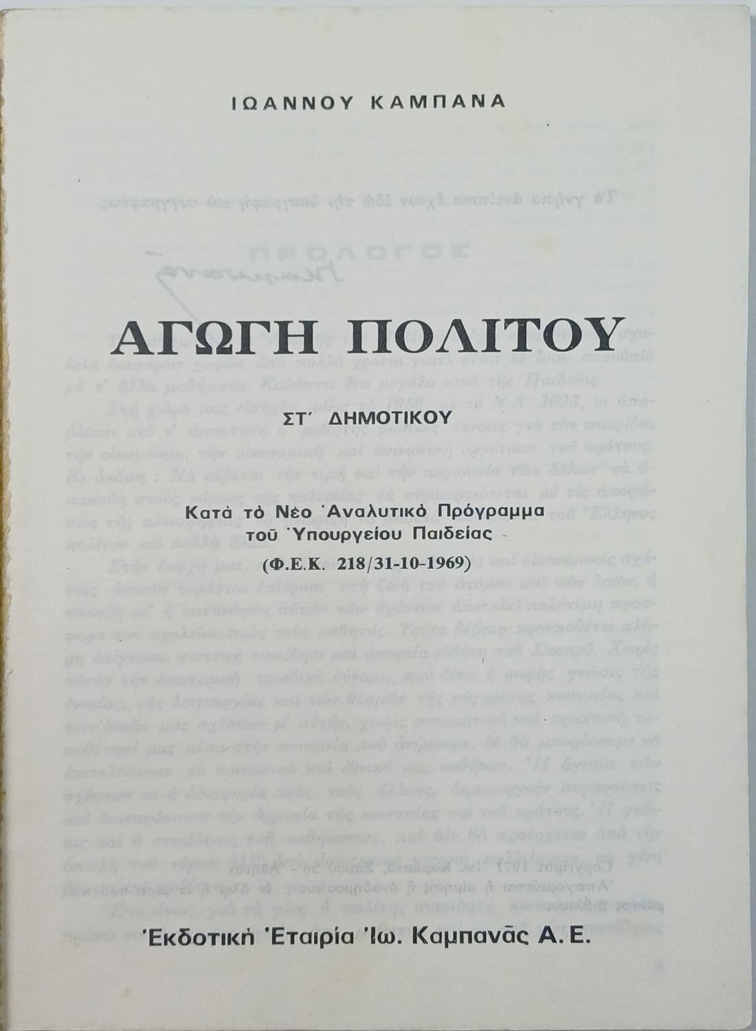 Το σπάνιο βιβλίο “Αγωγή του Πολίτου” του Ιωάννη Καμπανά για τη ΣΤ’ Δημοτικού είναι ένα παλιό σχολικό εγχειρίδιο που εστιάζει στα καθήκοντα του πολίτη, τη λειτουργία των κρατικών θεσμών, και την αξία των ανθρώπινων δικαιωμάτων, της ελευθερίας, της δημοκρατίας και της ισότητας, όπως ορίζονται από το Σύνταγμα. Η διδασκαλία του μαθήματος είχε ως στόχο τη διαμόρφωση του εθνικού φρονήματος και της πολιτικής συνείδησης των μαθητών, με το περιεχόμενο να προσαρμόζεται συχνά στο εκάστοτε πολιτικό κλίμα της εποχής έκδοσής του, όπως συνέβαινε με παρόμοια βιβλία κατά τις περιόδους της δικτατορίας του Μεταξά και της Χούντας, τα οποία προωθούσαν τον εθνικισμό και την υπακοή στο καθεστώς.