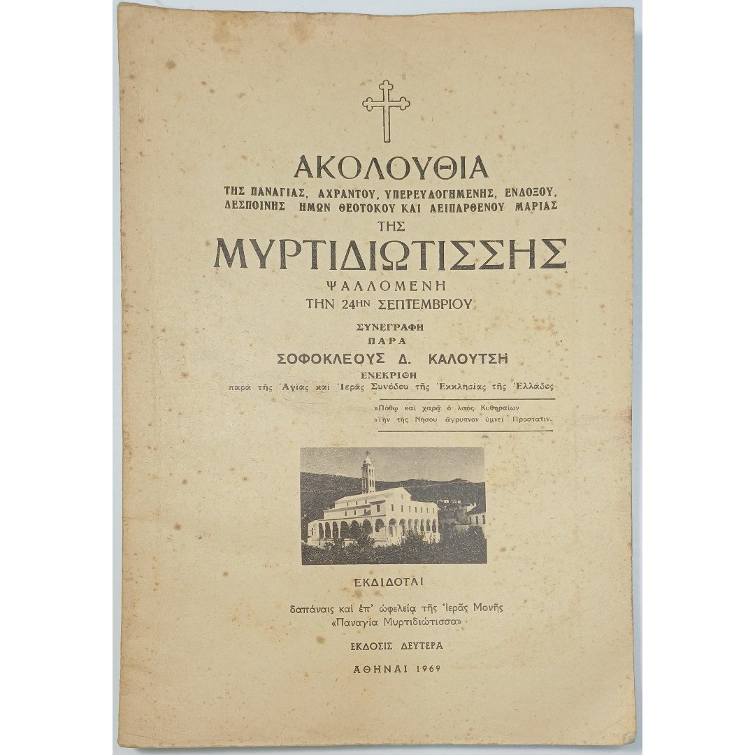 Το σπάνιο βιβλίο  “ΑΚΟΛΟΥΘΙΑ ΤΗΣ ΠΑΝΑΓΙΑΣ, ΑΧΡΑΝΤΟΥ, ΥΠΕΡΕΥΛΟΓΗΜΕΝΗΣ, ΕΝΔΟΞΟΥ, ΔΕΣΠΟΙΝΗΣ ΗΜΩΝ ΘΕΟΤΟΚΟΥ ΚΑΙ ΑΕΙΠΑΡΘΕΝΟΥ ΜΑΡΙΑΣ ΤΗΣ ΜΥΡΤΙΔΙΩΤΙΣΣΗΣ” είναι ένα λειτουργικό κείμενο της Ορθόδοξης Εκκλησίας, γραμμένο από τον Σοφοκλή Δ. Καλούτση και εγκεκριμένο από την Ιερά Σύνοδο της Εκκλησίας της Ελλάδος. Το βιβλίο αφορά την ακολουθία που ψάλλεται προς τιμήν της Παναγίας Μυρτιδιώτισσας, της προστάτιδας εικόνας των Κυθήρων, η οποία εορτάζεται στις 24 Σεπτεμβρίου.