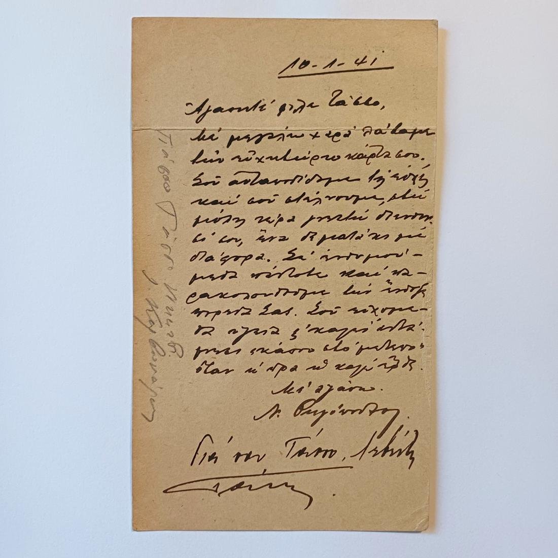 Στρατιωτικό Επιστολικό Δελτάριο Ατελές, τύπος καρτ-ποστάλ που επέτρεπε στους στρατιώτες να αλληλογραφούν δωρεάν με τους οικείους τους. Φέρει ημερομηνία 10 Ιανουαρίου 1941, Αθήνα, κατά τη διάρκεια του Β’ Παγκοσμίου Πολέμου και του Αλβανικού Έπους.
