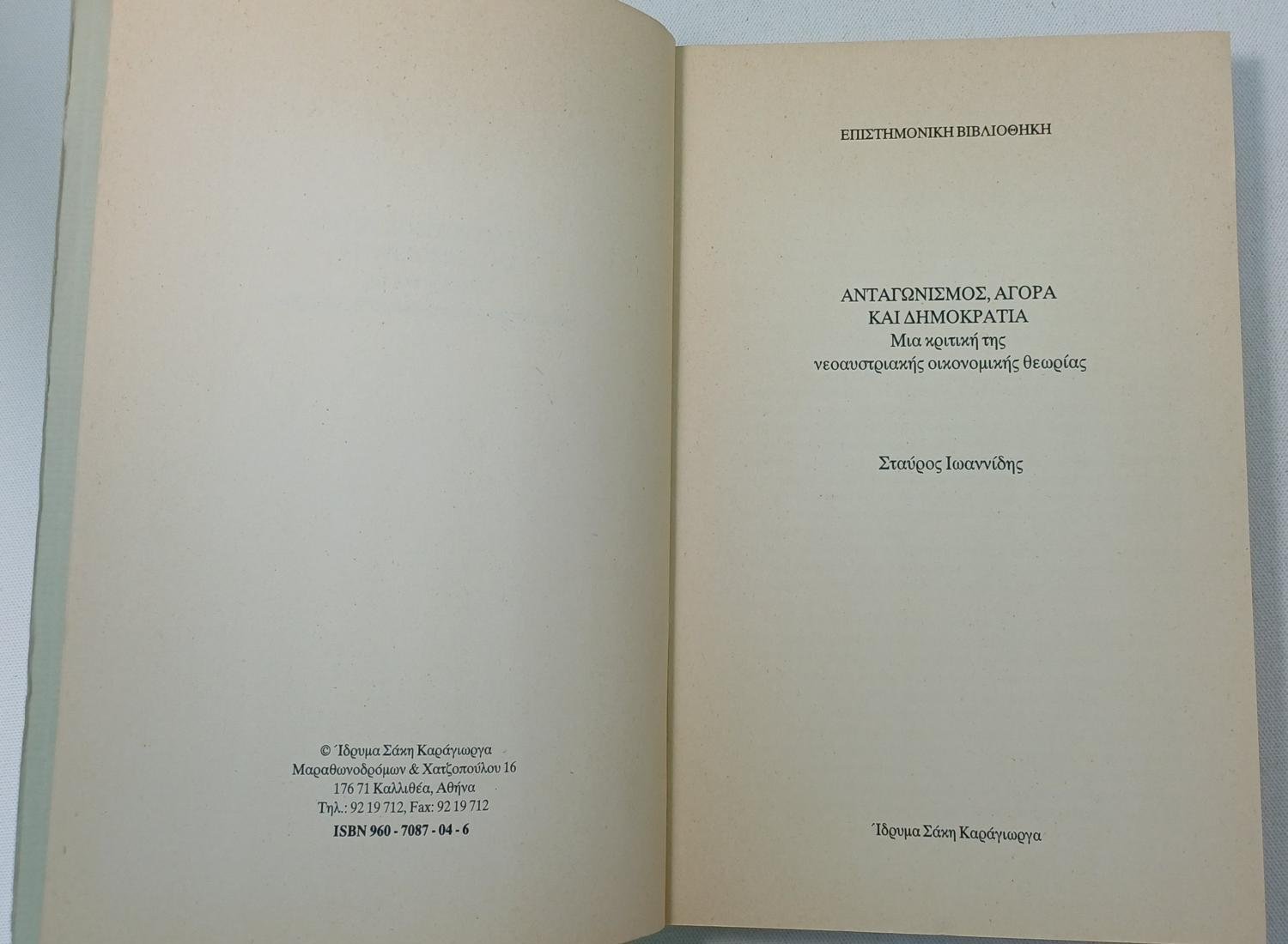 Το βιβλίο “Ανταγωνισμός, Αγορά και Δημοκρατία: Μια κριτική της Νεοαυστριακής οικονομικής θεωρίας” του Σταύρου Ιωαννίδη αποτελεί μια κριτική ανακατασκευή και ανάλυση της νεοαυστριακής οικονομικής θεωρίας. Η μελέτη αυτή αποκτά ιδιαίτερη βαρύτητα, καθώς τόσο η εσωτερική συγκρότηση της θεωρίας όσο και οι πολιτικές της προεκτάσεις αποτέλεσαν σημαντική βάση για τις νεοφιλελεύθερες ιδέες. Ουσιαστικά, το βιβλίο ερευνά την εσωτερική «λογική» αυτής της θεωρίας και οριοθετεί κριτικά την πολιτικο-ιδεολογική της εμβέλεια, συνδέοντάς την με τη συντηρητική κοινωνική ιδεολογία.