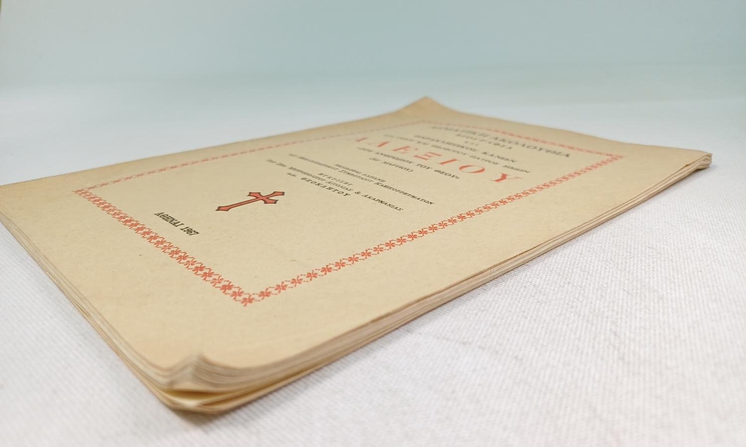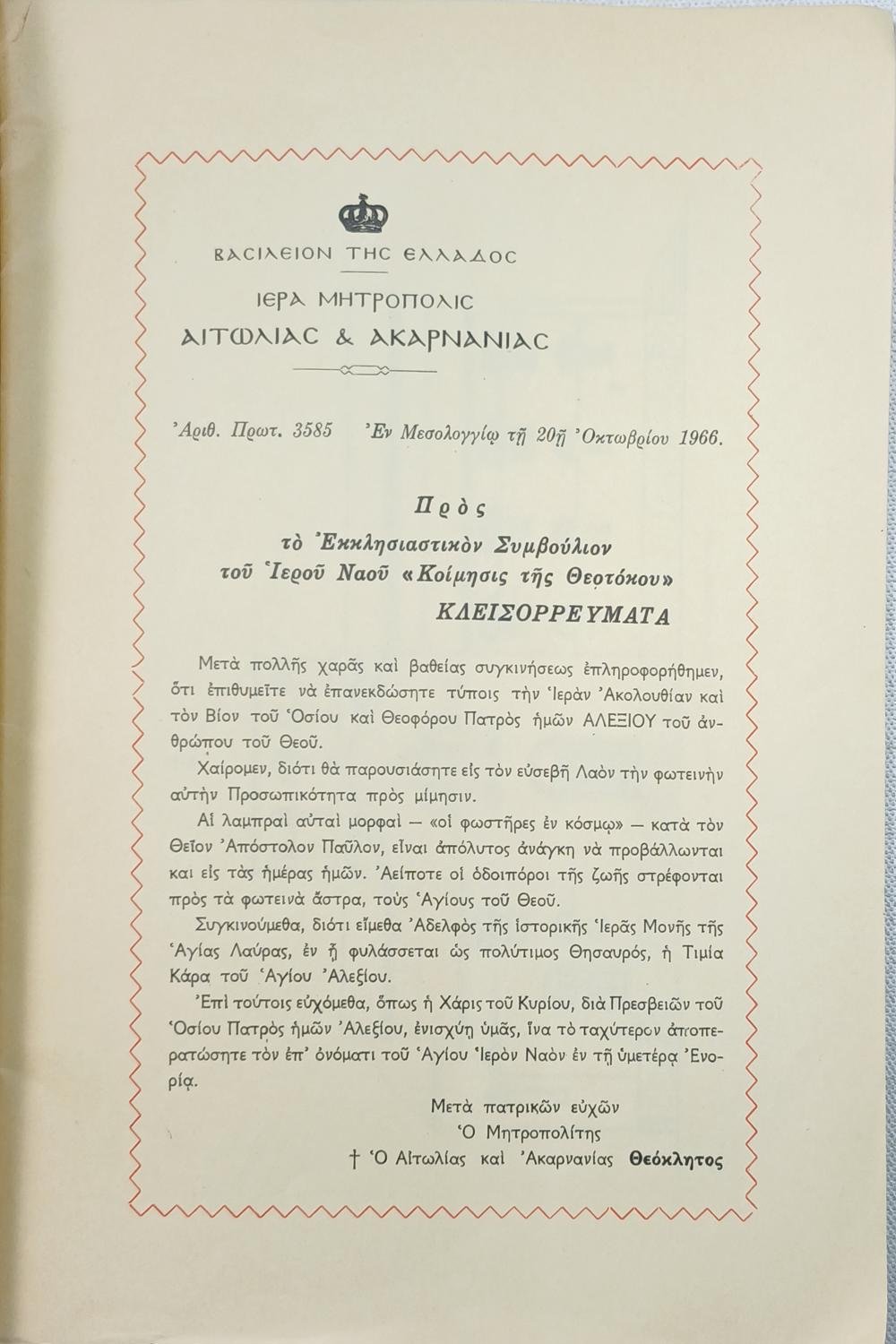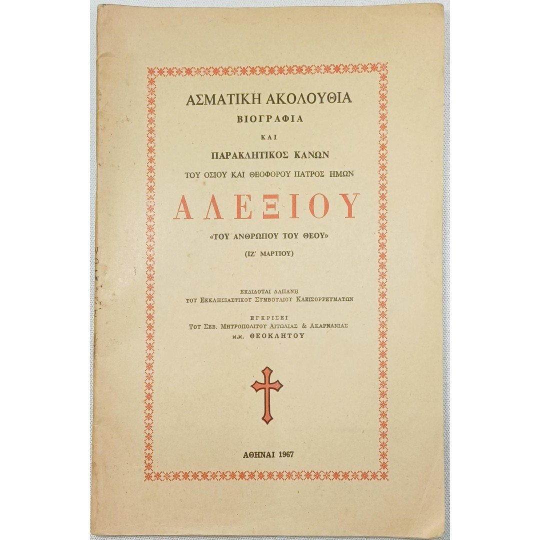 Το βιβλίο «Ασματική Ακολουθία, Βιογραφία και Παρακλητικός Κανών του Οσίου και Θεοφόρου Πατρός Ημών Αλεξίου “Του Ανθρώπου του Θεού”». Το βιβλίο αυτό αποτελεί μια θρησκευτική έκδοση, η οποία περιλαμβάνει τον πλήρη βίο, την ειδική ασματική ακολουθία (υμνολογικό κείμενο) και τον παρακλητικό κανόνα προς τιμήν του Αγίου Αλεξίου, που εορτάζεται στις 17 Μαρτίου.
