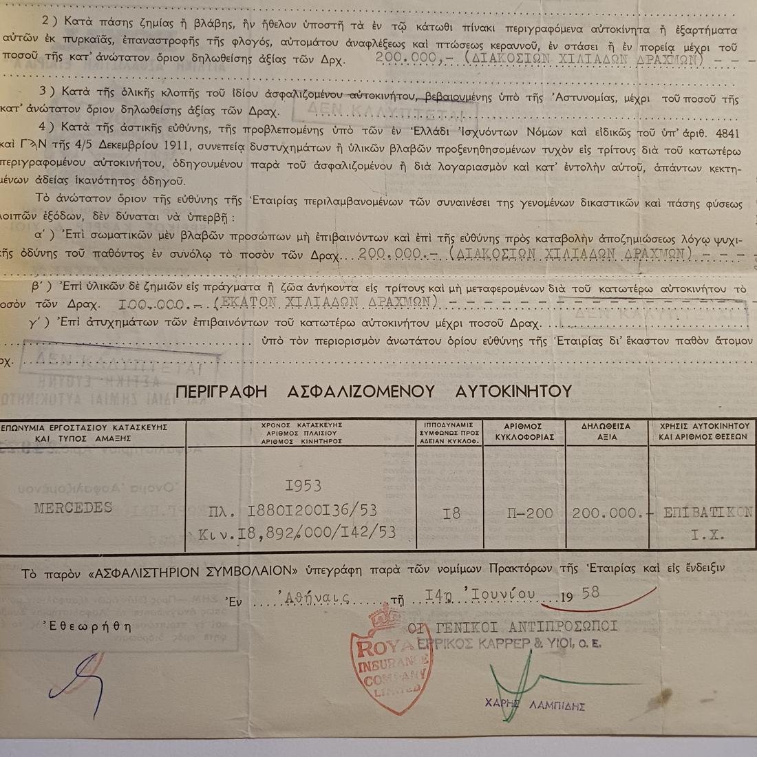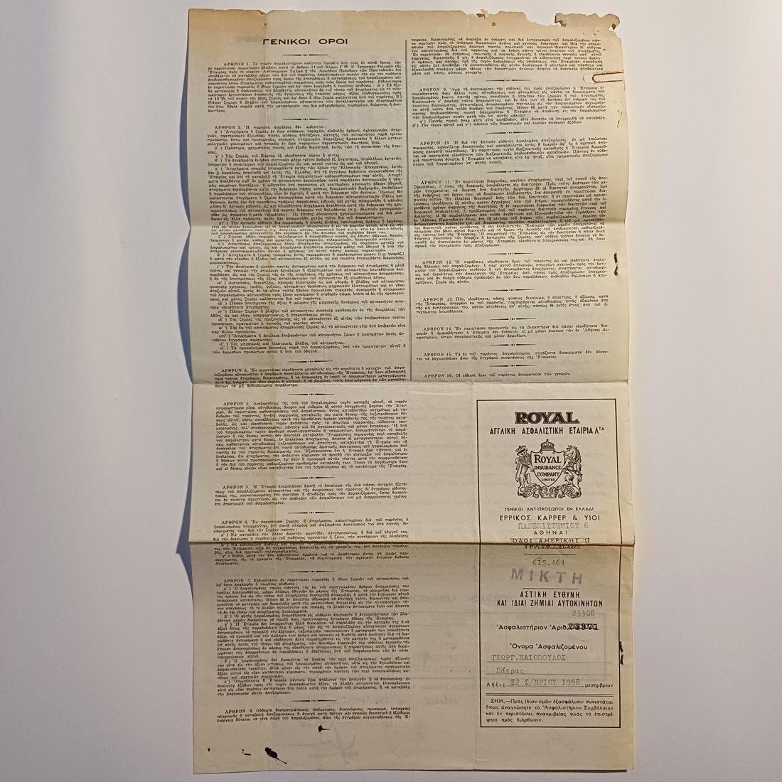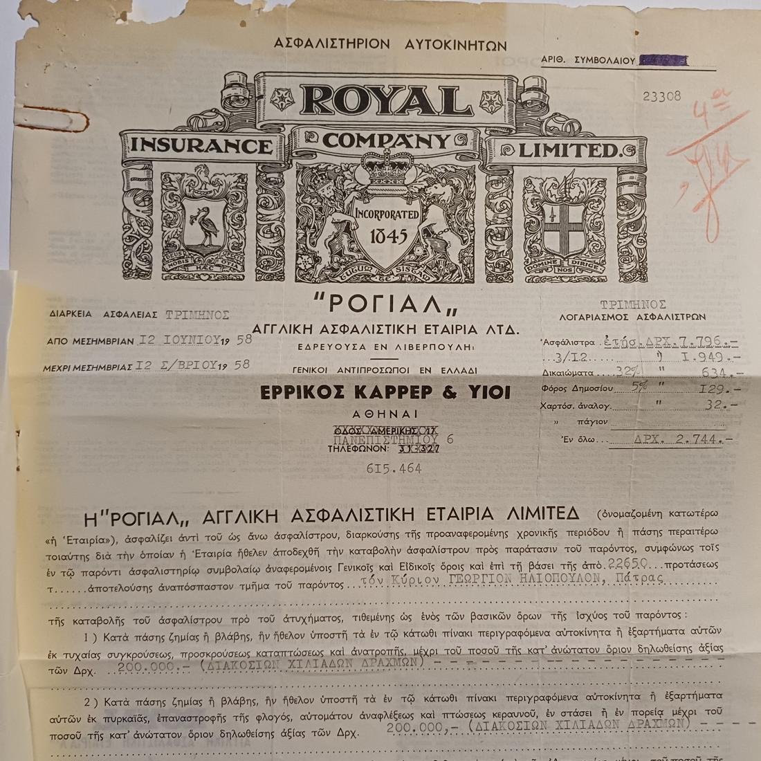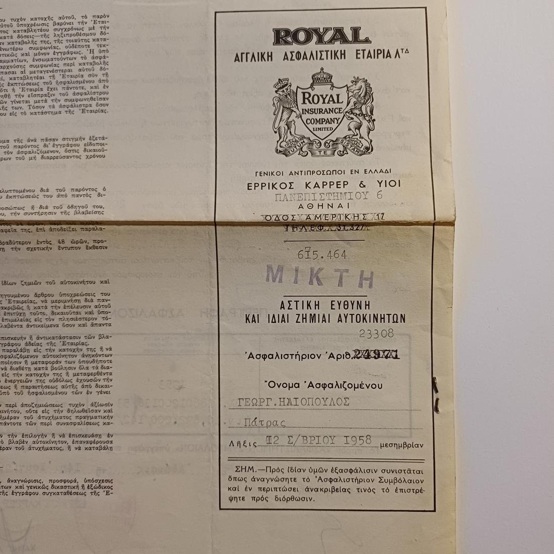 Ασφαλιστήριο συμβόλαιο αυτοκινήτου της βρετανικής εταιρείας “Royal Insurance Company Limited”, η οποία ιδρύθηκε στο Λίβερπουλ το 1845 και αργότερα, το 1996, συγχωνεύτηκε για να δημιουργήσει τον κολοσσό Royal & Sun Alliance (RSA). Εκδόθηκε στην Ελλάδα στις 14 Ιουνίου 1958 μέσω των Γενικών Αντιπροσώπων Apper & Υιοί (Apper & Sons), οι οποίοι διατηρούσαν γραφεία στην Αθήνα και την Πάτρα. Στο περιεχόμενό του περιλαμβάνονται αναλυτικοί πίνακες με τα ασφάλιστρα σε δραχμές (συνολικό ποσό 2.744 δρχ.), ειδικοί όροι για εκπτώσεις λόγω μη πρόκλησης ζημιών, καθώς και καλύψεις για αστική ευθύνη έναντι τρίτων ύψους 200.000 δραχμών. Το έγγραφο λειτουργεί ως τεχνικό δελτίο του ασφαλισμένου οχήματος, καταγράφοντας στοιχεία όπως η φορολογήσιμη ισχύς (HP) και ο αριθμός πλαισίου, αποτελώντας σήμερα ένα σπάνιο συλλεκτικό τεκμήριο της ασφαλιστικής αγοράς της μεταπολεμικής Ελλάδας.