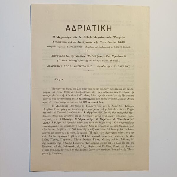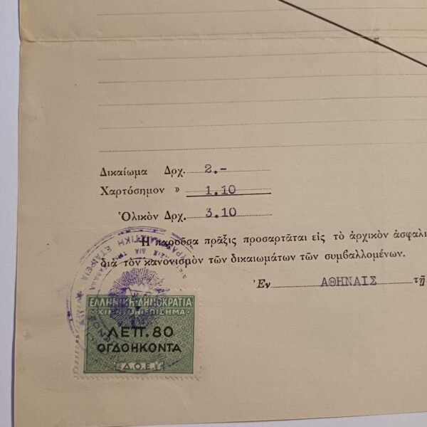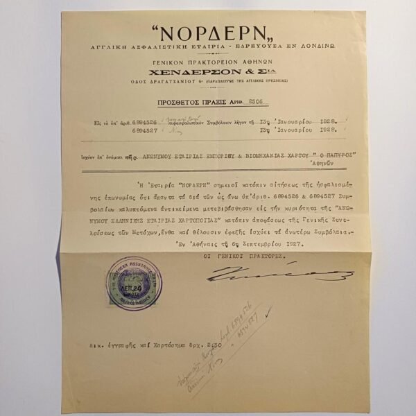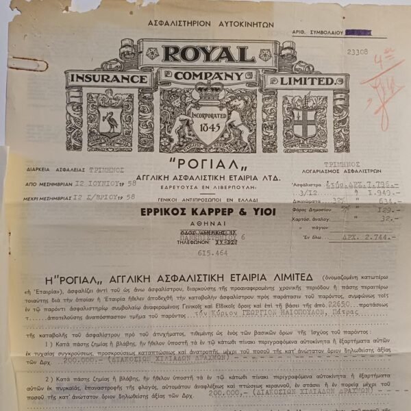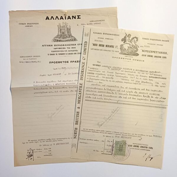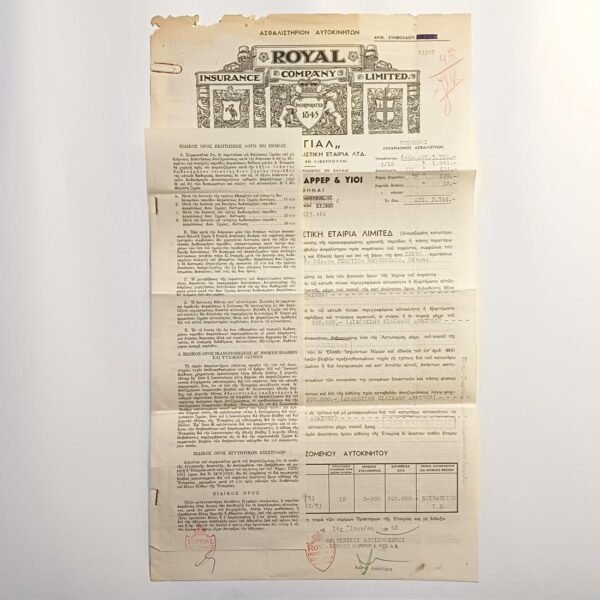 Ασφαλιστήριο συμβόλαιο φορτίου (Marine Insurance Policy) της βρετανικής εταιρείας “Reliance Marine Insurance Company Limited”, με έδρα το Λίβερπουλ, η οποία εκείνη την περίοδο εκπροσωπούνταν στην Ελλάδα από τους Ιωάννη & Νικ. Ε. Τσαούση