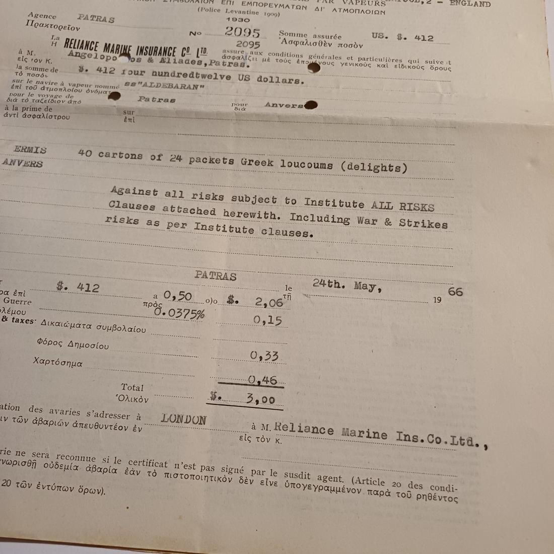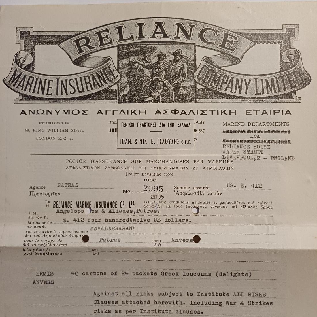 Ασφαλιστήριο συμβόλαιο φορτίου (Marine Insurance Policy) της βρετανικής εταιρείας “Reliance Marine Insurance Company Limited”, με έδρα το Λίβερπουλ, η οποία εκείνη την περίοδο εκπροσωπούνταν στην Ελλάδα από τους Ιωάννη & Νικ. Ε. Τσαούση. Εκδόθηκε στο υποκατάστημα της Πάτρας στις 24 Μαΐου 1966 για λογαριασμό των «Angelopoulos & Eliades» και αφορούσε την ασφάλιση 40 χαρτοκιβωτίων με ελληνικά λουκούμια (Greek Loucoums/Delights). Το φορτίο ήταν προγραμματισμένο να μεταφερθεί με το ατμόπλοιο “ALDEBARAN” από το λιμάνι της Πάτρας προς την Αμβέρσα (Anvers) του Βελγίου, με το ασφαλισμένο ποσό να ανέρχεται στα 412 δολάρια ΗΠΑ. Το έγγραφο περιλαμβάνει λεπτομέρειες για τα ασφάλιστρα και τους φόρους, ενώ φέρει την ειδική σημείωση ότι η κάλυψη περιλαμβάνει κινδύνους πολέμου και απεργιών σύμφωνα με τους ρήτρες του Ινστιτούτου (Institute Clauses).