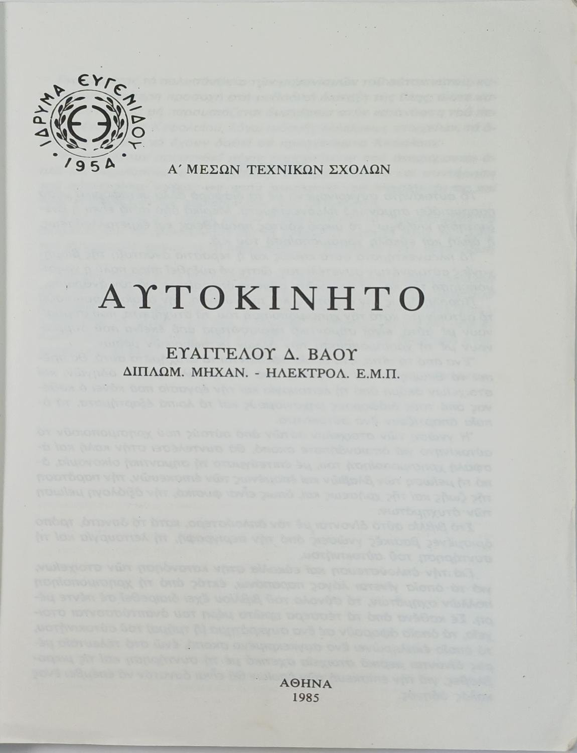 Το σπάνιο βιβλίο “ΑΥΤΟΚΙΝΗΤΟ”, γραμμένο από τον Ευάγγελο Βάο, αποτελεί ένα τεχνικό εγχειρίδιο μηχανολογίας αυτοκινήτου, σχεδιασμένο ειδικά για εκπαιδευτικούς σκοπούς στις Μέσες Τεχνικές Σχολές, καλύπτοντας τη μηχανολογία του αυτοκινήτου και τα αμαξώματα, όπως περιγράφεται και σε βιβλιογραφικούς καταλόγους. Πρόκειται για έναν εκτενή οδηγό που περιλαμβάνει λεπτομερή περιγραφή του αυτοκινήτου, τη λειτουργία του και οδηγίες για τη συντήρησή του, παρέχοντας τις βασικές γνώσεις για τη λειτουργία και τις τεχνικές πτυχές των οχημάτων.