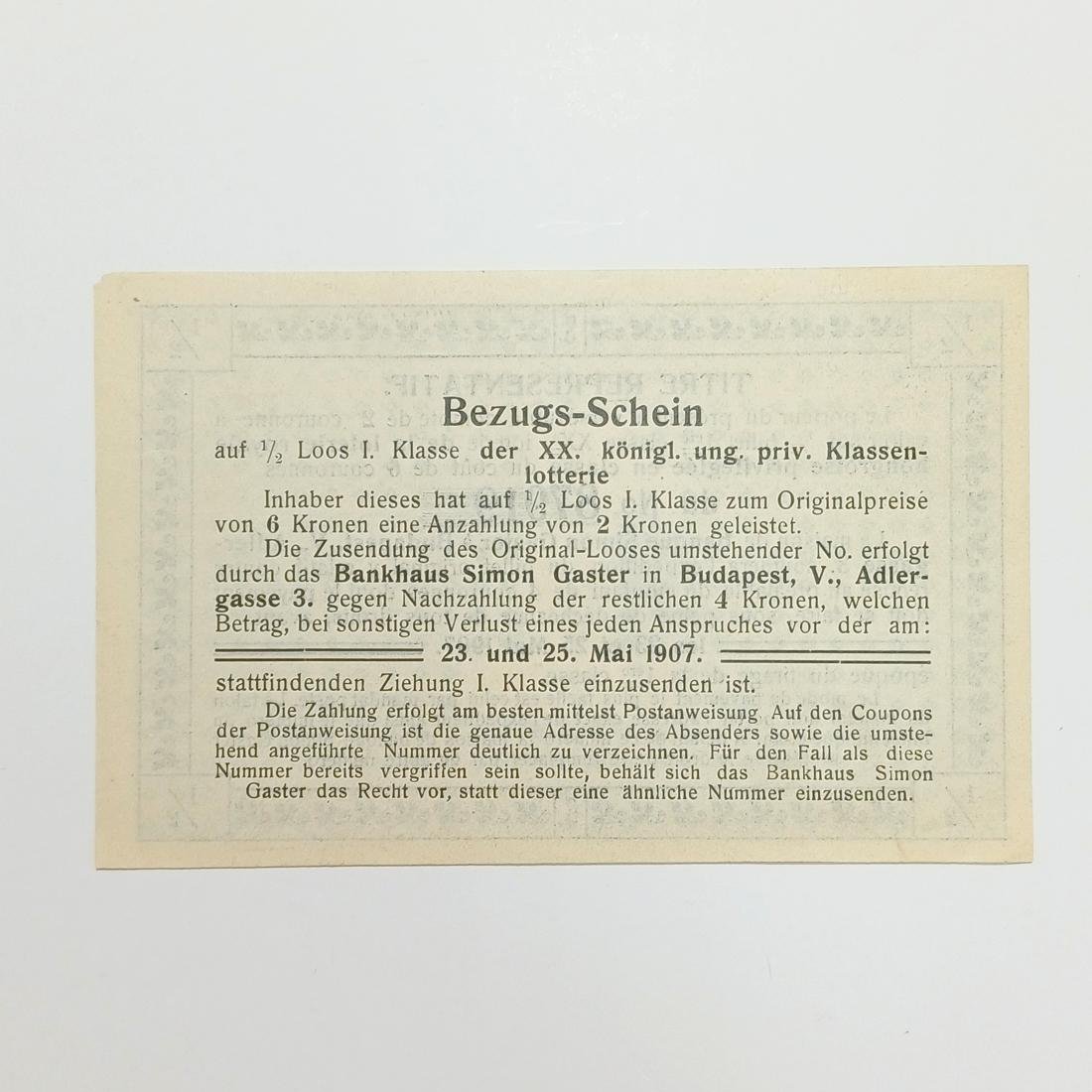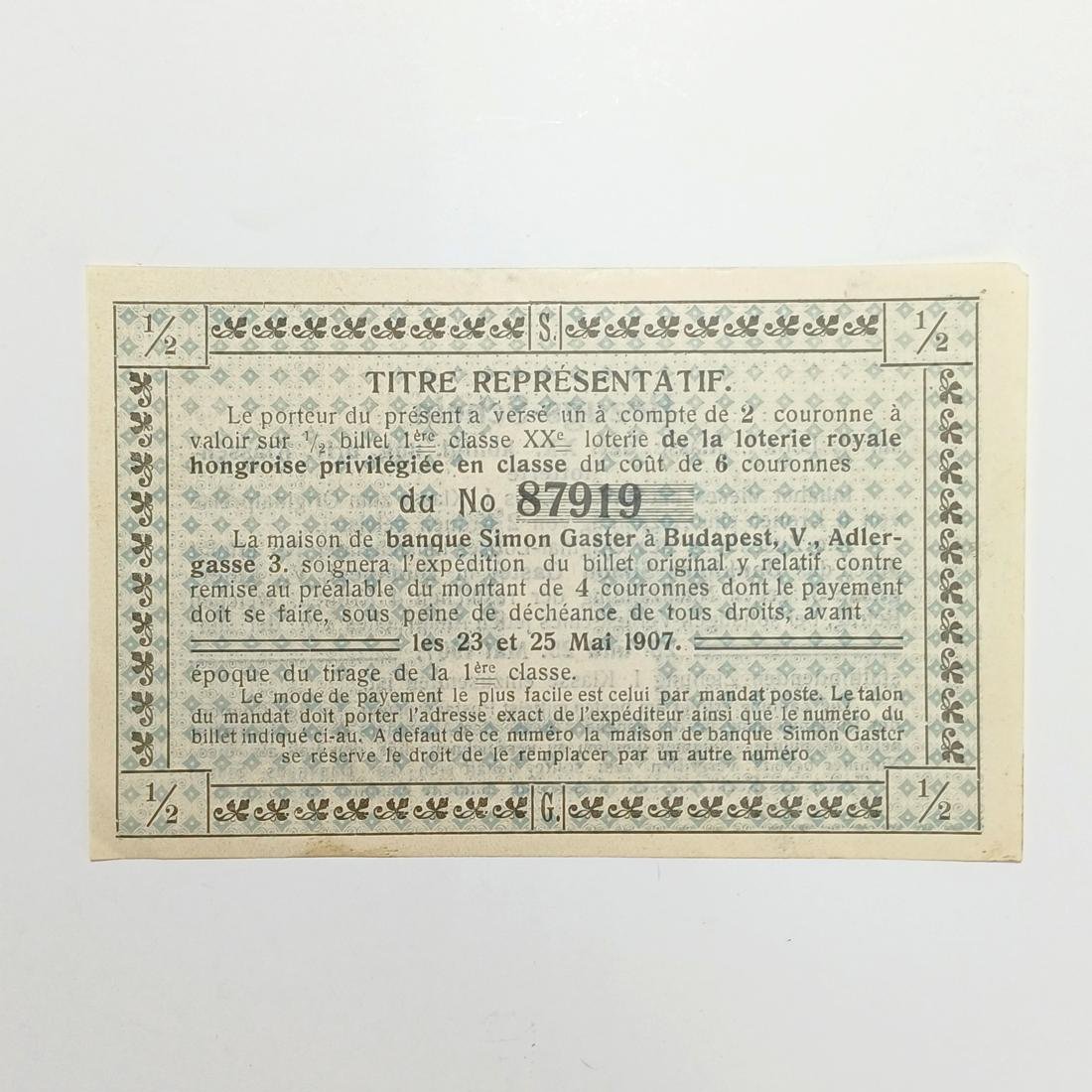 “Titre Représentatif”, που αφορά τη Βασιλική Ουγγρική Λοταρία (Loterie Royale Hongroise) του 1907. Πρόκειται για μια απόδειξη προκαταβολής 2 κορωνών για τη συμμετοχή στην 20ή περίοδο (classe XX) της λοταρίας, με τον αριθμό λαχνού 87919. Η έκδοση πραγματοποιήθηκε από τον τραπεζικό οίκο Simon Gaster με έδρα τη Βουδαπέστη (διεύθυνση Adlergasse 3), και αναφέρει ότι για την παραλαβή του αυθεντικού λαχνού έπρεπε να εξοφληθεί το υπόλοιπο ποσό των 4 κορωνών πριν από τις κληρώσεις, οι οποίες ήταν προγραμματισμένες για τις 23 και 25 Μαΐου 1907.