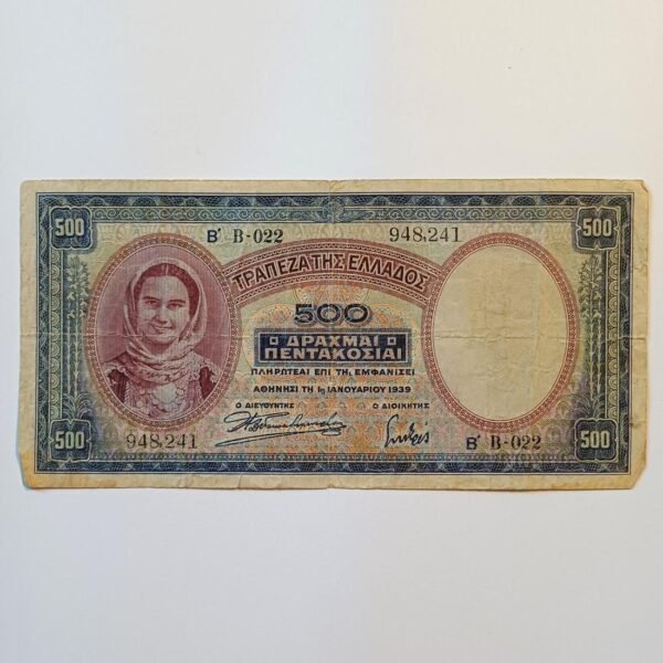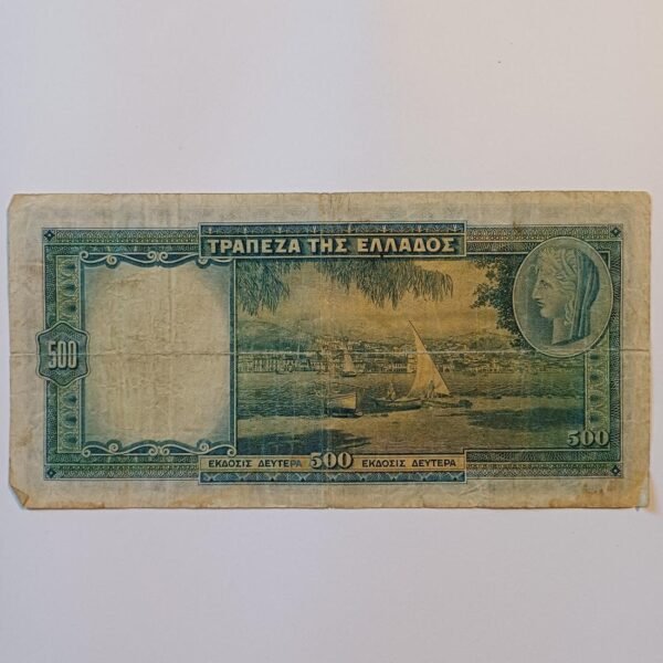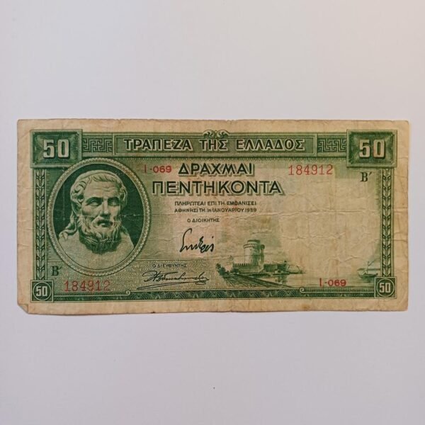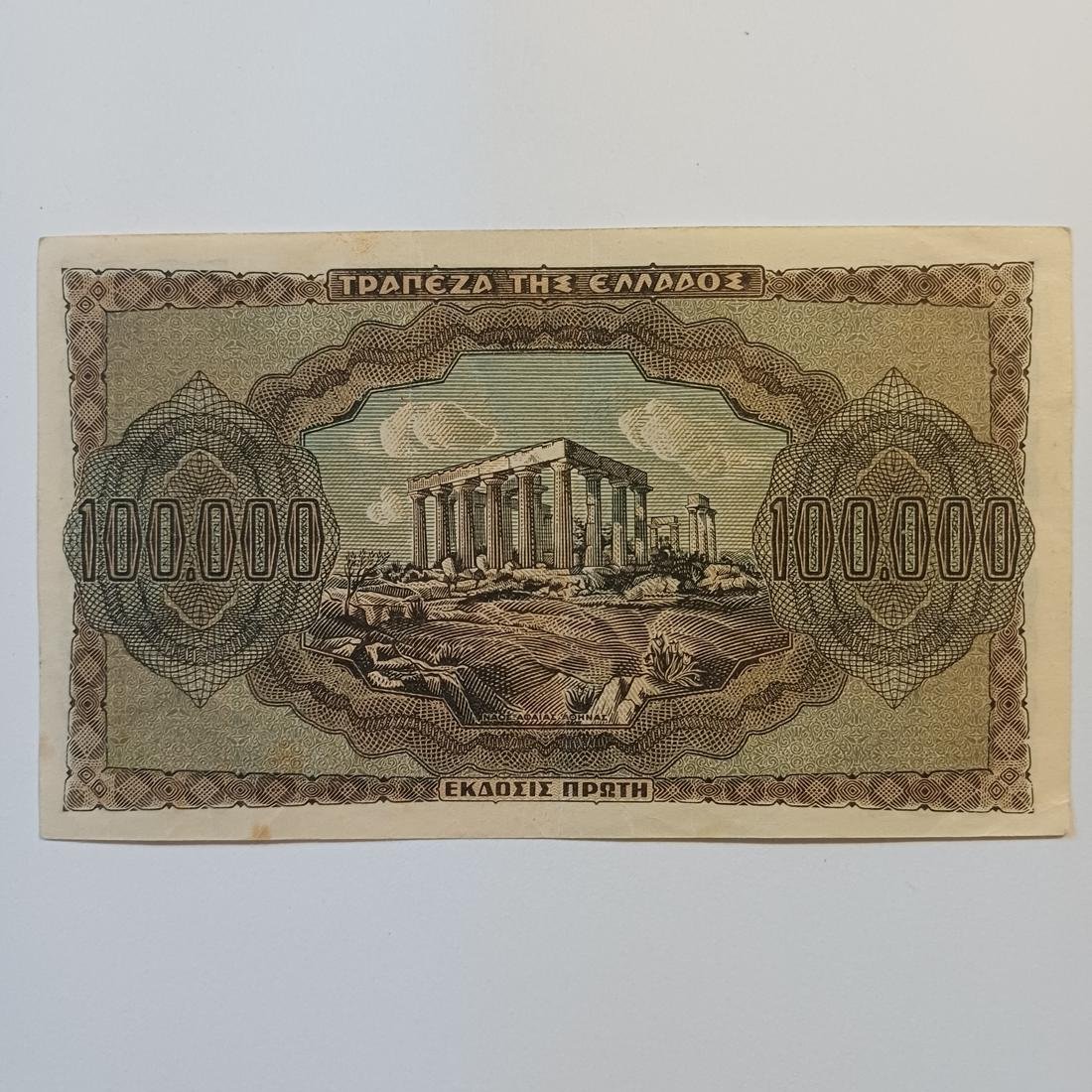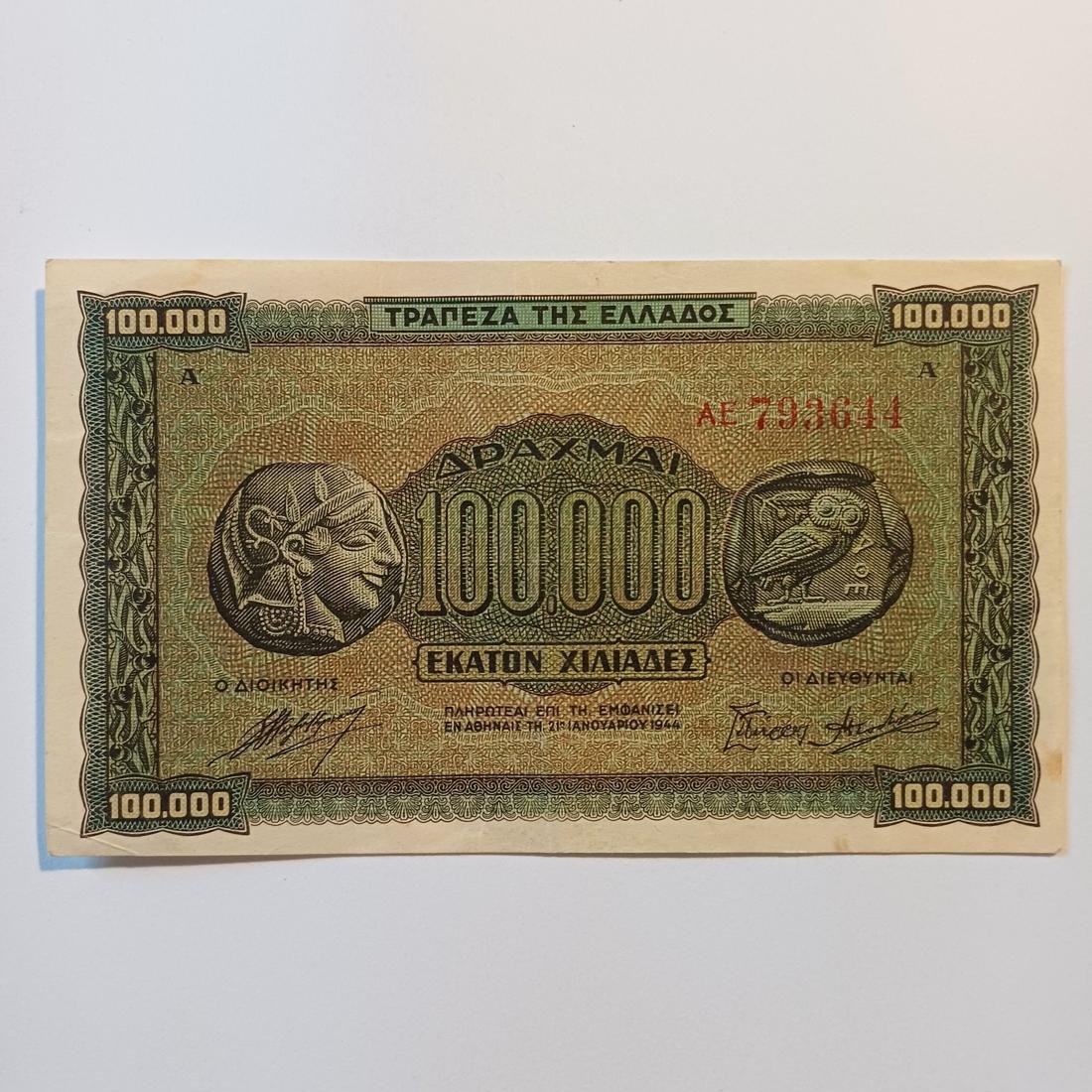 Χαρτονόμισμα των 100.000 δραχμών που εκδόθηκε από την Τράπεζα της Ελλάδος στις 21 Ιανουαρίου 1944, κατά τη διάρκεια της γερμανικής κατοχής. Αποτελεί χαρακτηριστικό δείγμα της περιόδου του υπερπληθωρισμού, όταν η αξία του χρήματος μειωνόταν ραγδαία και εκδίδονταν χαρτονομίσματα με ολοένα και μεγαλύτερες ονομαστικές αξίες. Στην μπροστινή όψη φέρει κλασικά ελληνικά σύμβολα, την κεφαλή της Θεάς Αθηνάς στην αριστερή πλευρά και την κουκουβάγια στη δεξιά, στοιχεία που παραπέμπουν στα αρχαία αθηναϊκά νομίσματα.