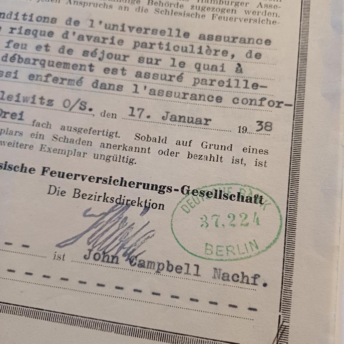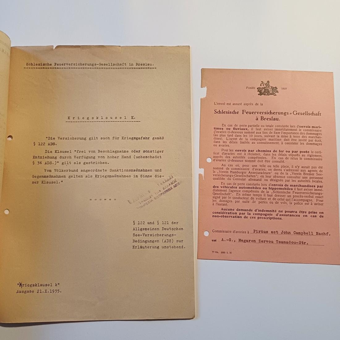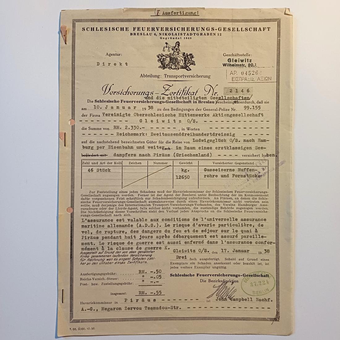 Γερμανικό πιστοποιητικό ασφάλισης μεταφοράς (Versicherungs-Zertifikat) με αριθμό 2146, εκδοθέν στις 17 Ιανουαρίου 1938 από την εταιρεία Schlesische Feuerversicherungs-Gesellschaft στο Gleiwitz (Γκλάιβιτς). Αφορά την ασφαλιστική κάλυψη ενός φορτίου 46 τεμαχίων χυτοσιδηρών σωλήνων (συνολικού βάρους 12.650 κιλών) που ανήκαν στην εταιρεία Vereinigte Oberschlesische Hüttenwerke AG. Το εμπόρευμα είχε ως σημείο εκκίνησης το Ludwigshglück, μεταφέρθηκε σιδηροδρομικώς στο Αμβούργο και από εκεί φορτώθηκε σε ατμόπλοιο με τελικό προορισμό τον Πειραιά. Η συνολική ασφαλισμένη αξία ανερχόταν στα 2.330 Ράιχσμαρκ (RM), ενώ στο κάτω μέρος του εγγράφου διακρίνεται η ελληνική σφραγίδα «ΕΙΣΠΡΑΞΙΣ ΑΞΙΩΝ» και τα στοιχεία του τοπικού αντιπροσώπου στον Πειραιά, John Campbell Nachf., ο οποίος έδρευε στο Μέγαρο Ζερβού στην οδό Τσαμαδού.