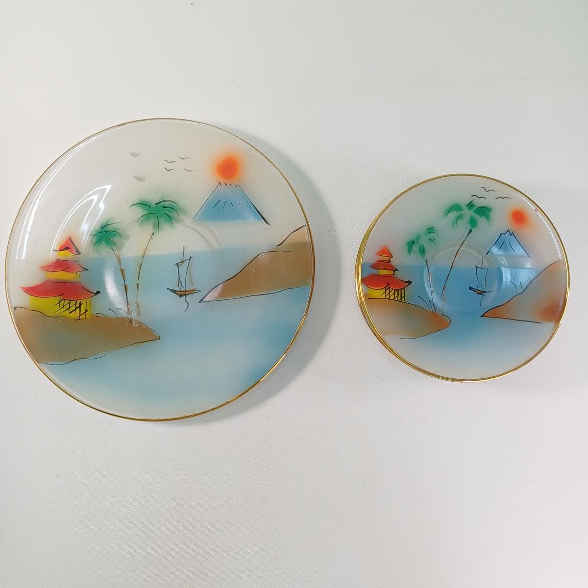 Γυάλινα πιάτα με Ιαπωνικά τοπία ζωγραφισμένα στο χέρι. Το σετ αποτελείται από 1 μεγάλο πιάτο και 6 μικρά πιατάκια