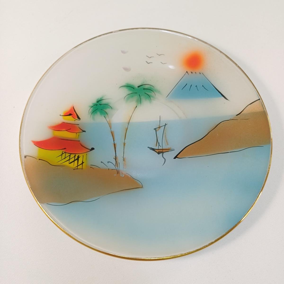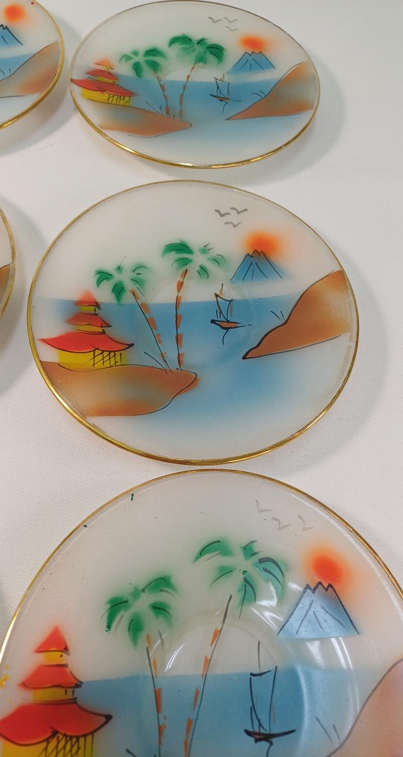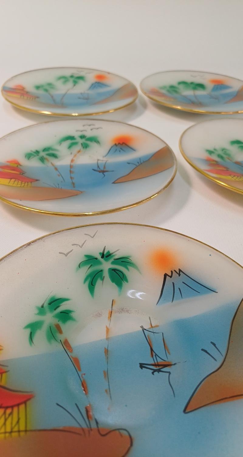 Γυάλινα πιάτα με Ιαπωνικά τοπία ζωγραφισμένα στο χέρι. Το σετ αποτελείται από 1 μεγάλο πιάτο διαμέτρου 25,5 cm και 6 πιατάκια διαμέτρου 16 cm. Είναι μεταχειρισμένα, σε καλή κατάσταση. Υπάρχουν ορισμένες διαφορές στα σχέδια μεταξύ τους λόγω του ότι είναι ζωγραφισμένα στο χέρι.