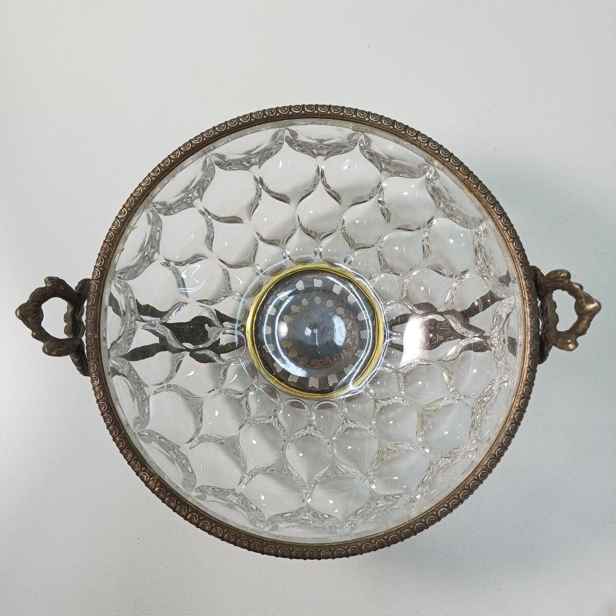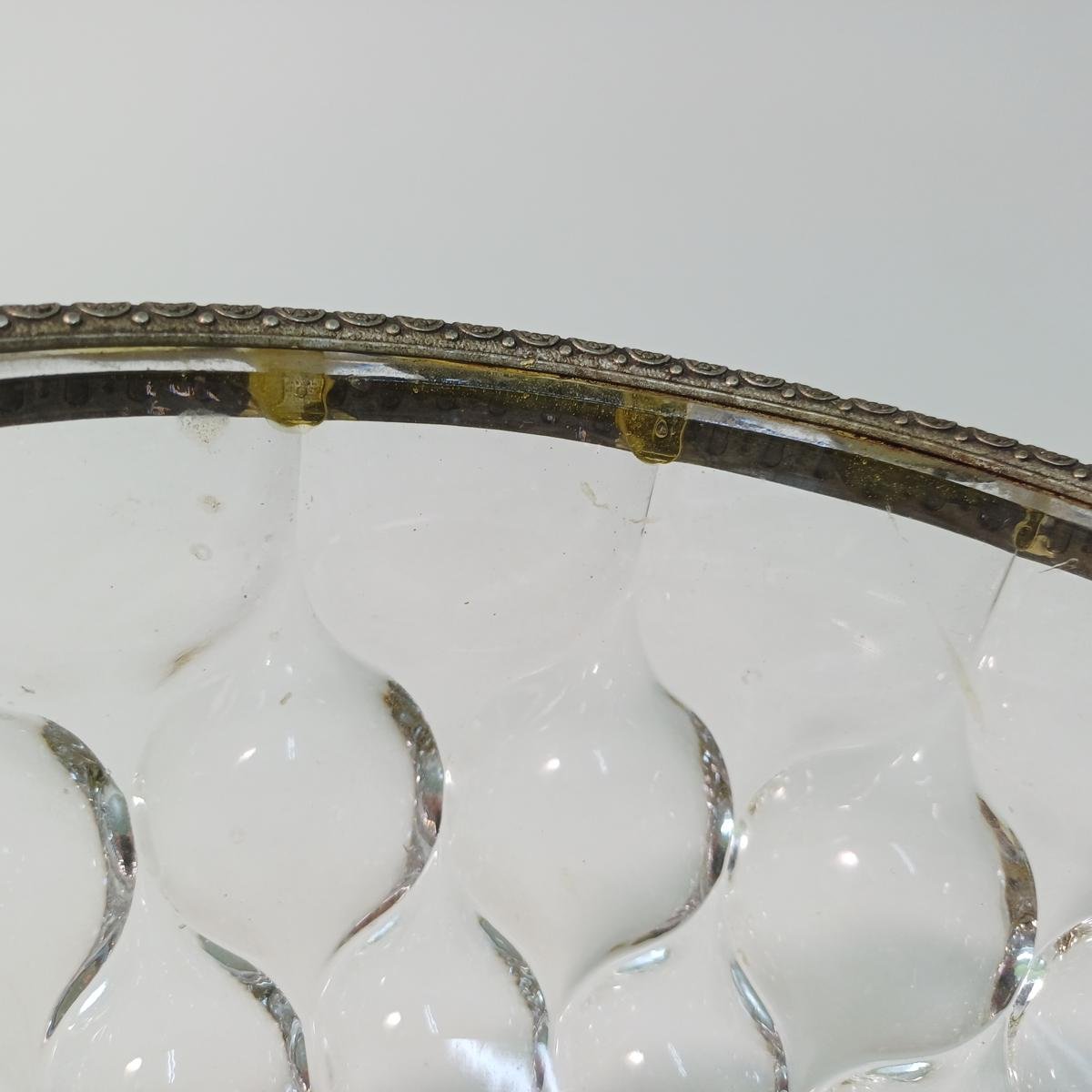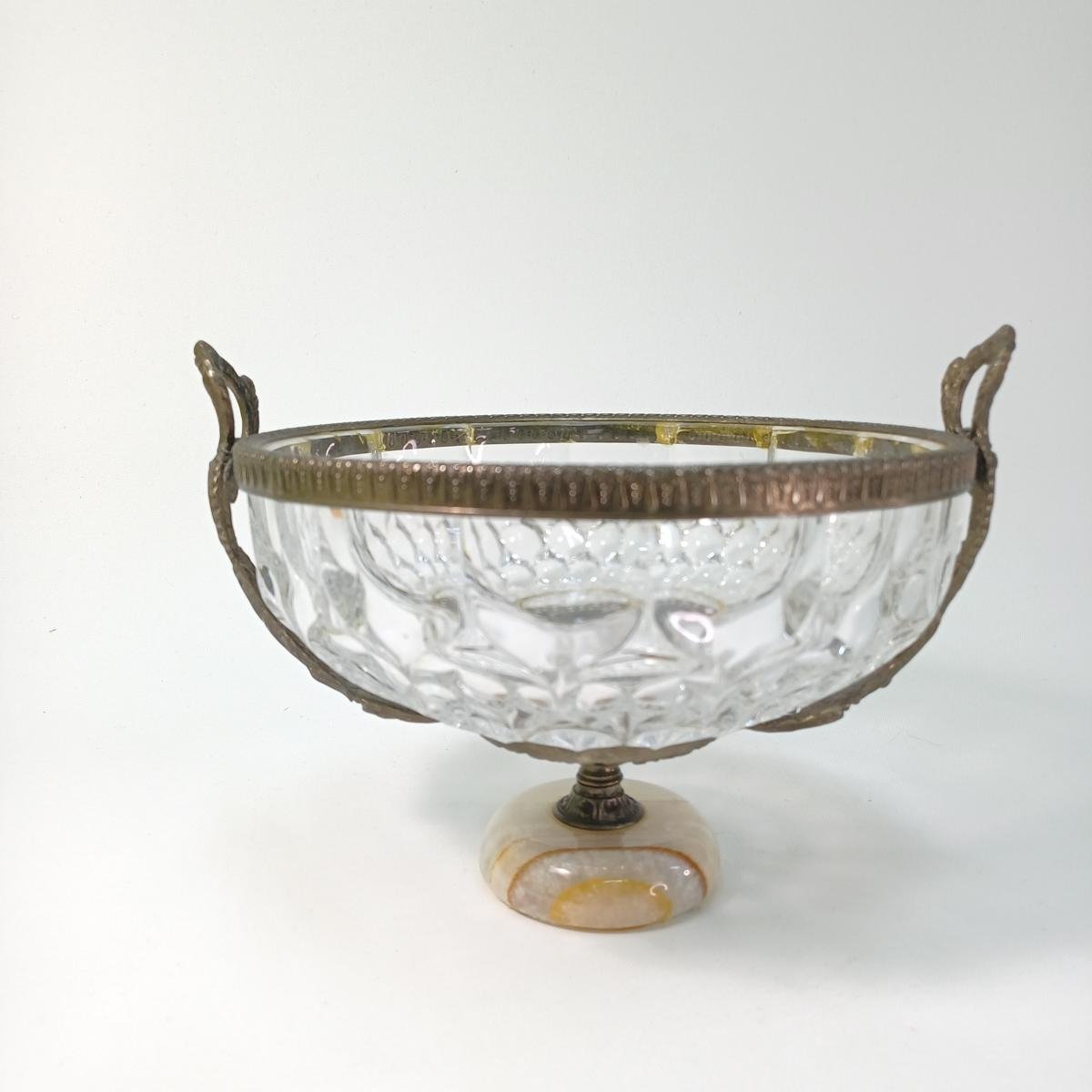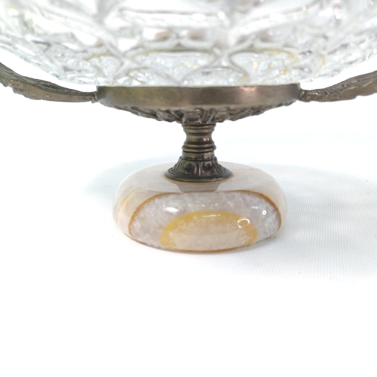 1) 1 φρουτιέρα από γυαλί, μέταλλο και μαρμάρινη βάση. Η διάμετρός της είναι περίπου 21 cm και το ύψος της 14 cm. Έχει ορισμένα σημάδια στην ένωση του μετάλλου με το γυαλί λόγω παλαιότητας.