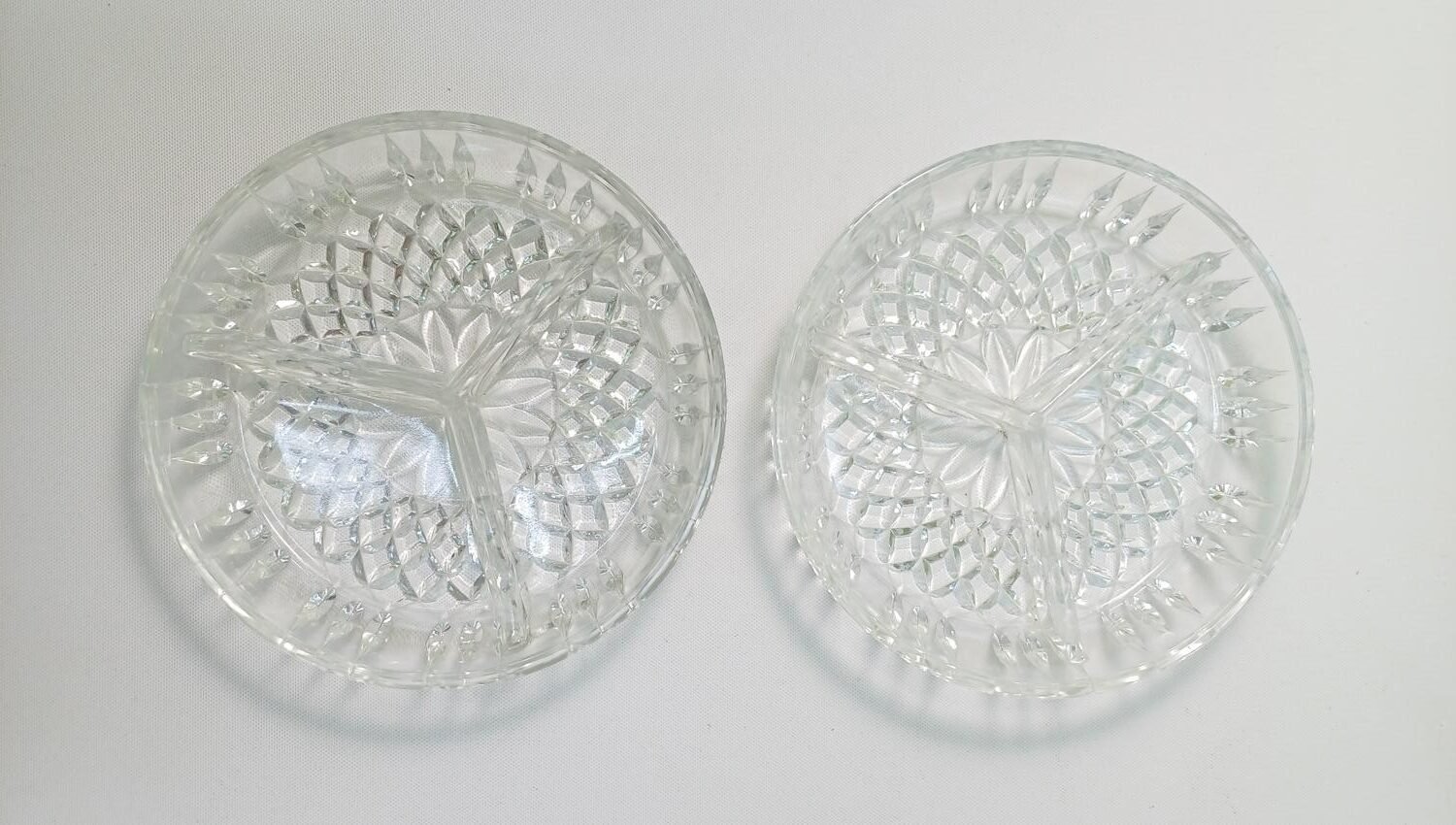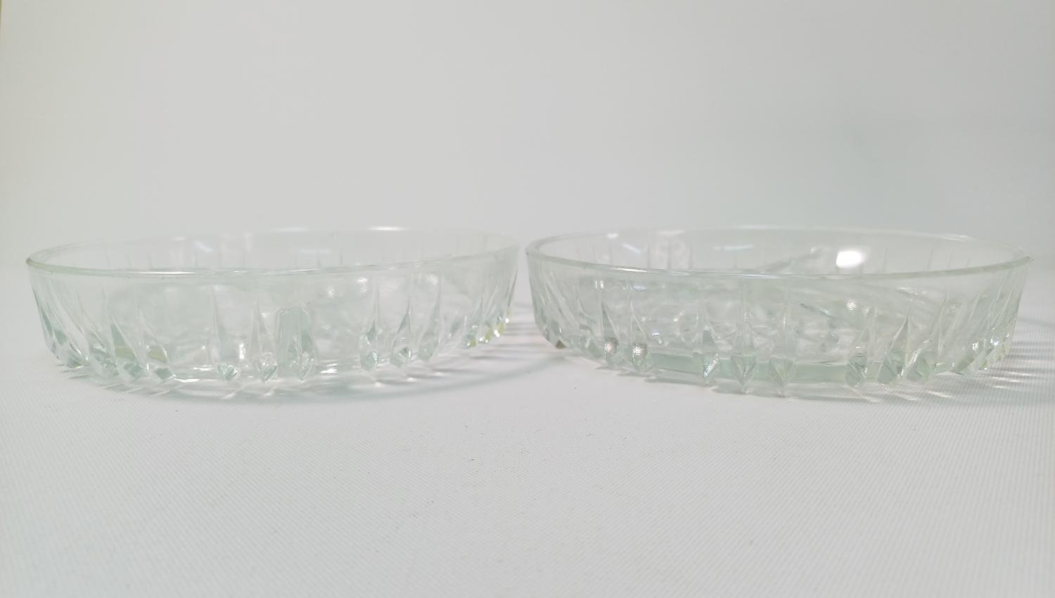 2) 2 κρυστάλλινα μπολ τριών θέσεων για ξηρούς καρπούς, διαμέτρου 18 cm και ύψους 4 cm. Είναι σε καλή κατάσταση.