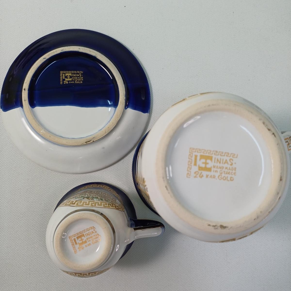 LOT 4 διακοσμητικών σουβενίρ διαφόρων ειδών. Αποτελείται από χειροποίητα πορσελάνινα αντικείμενα σε μπλε σκούρο και άσπρο χρώμα με αρχαιοελληνικές παραστάσεις και λεπτομέρειες με χρυσό 24 Κ (Made in Greece). Το LOT περιλαμβάνει 2 φλυτζανάκια με το πιατάκι τους, 1 μπολ και 1 κούπα. Είναι όλα μεταχειρισμένα σε άριστη κατάσταση.