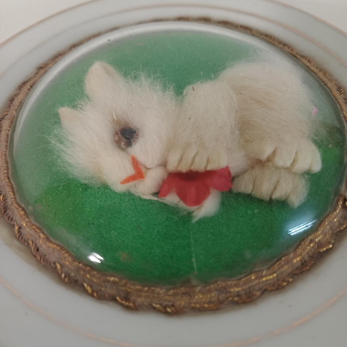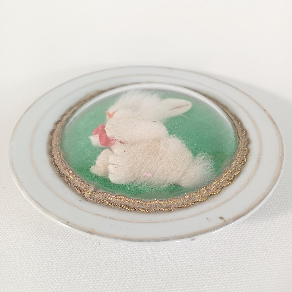 Διακοσμητικό κεραμικό πιατάκι με ενσωματωμένο λούτρινο λαγουδάκι στο κέντρο. Πρόκειται για ένα vintage πιατάκι προηγούμενων δεκαετιών. Μέσα από το κεντρικό τσάμι υπάρχει ένα λούτρινο λαγουδάκι που κρατάει ένα λουλούδι.
