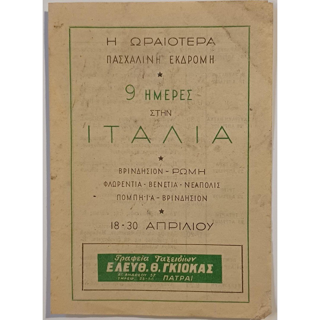 Διαφημιστικό booklet εποχής , τουριστικoύ γραφείου Γκιόκα στην Πάτρα το οποίο παρουσιάζει προσφορά πασχαλινής εκδρομής στην Ιταλία . Διαστάσεις 17 x 12.5