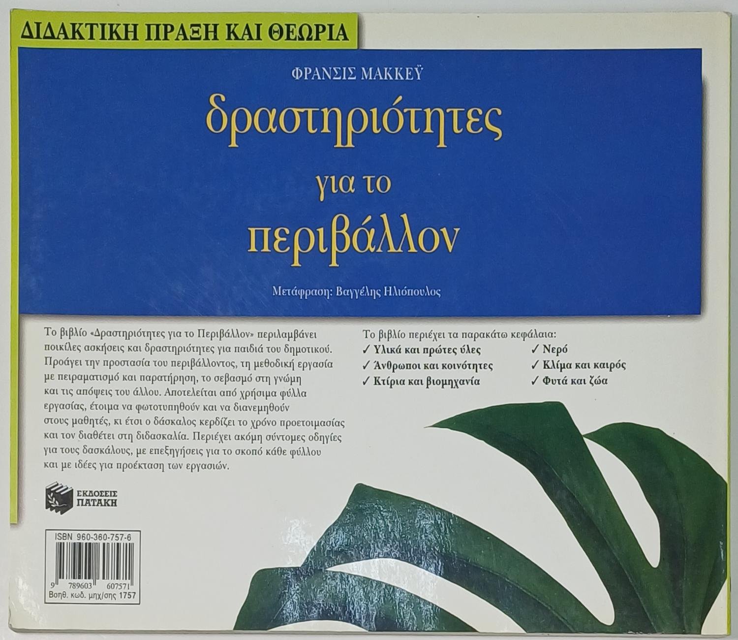 Το βιβλίο «Δραστηριότητες για το περιβάλλον» του Φράνσις ΜακΚέυ είναι ένα χρήσιμο εγχειρίδιο, κυρίως για εκπαιδευτικούς πρωτοβάθμιας εκπαίδευσης, που περιλαμβάνει ποικίλες ασκήσεις και φύλλα εργασίας (έτοιμα για φωτοτύπηση) σχεδιασμένα να προάγουν την προστασία του περιβάλλοντος, τη μεθοδική εργασία με πειραματισμό και παρατήρηση, καθώς και τον σεβασμό στις απόψεις των άλλων.