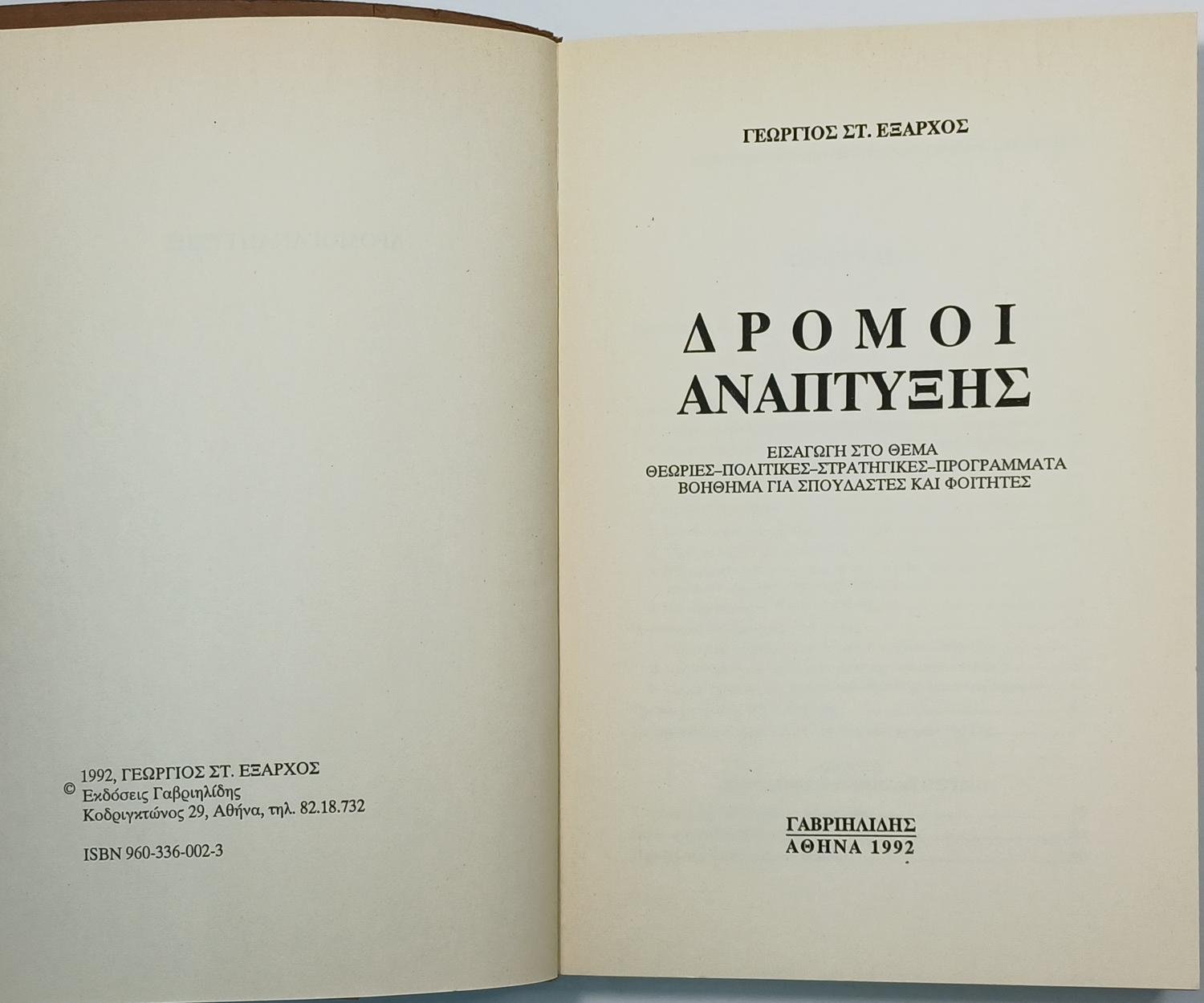 Το βιβλίο “Δρόμοι Ανάπτυξης” του Γεωργίου Στ. Εξάρχου λειτουργεί ως εκπαιδευτικό βοήθημα για φοιτητές και σπουδαστές, προσφέροντας μια εισαγωγή στο ευρύ θέμα της ανάπτυξης. Καλύπτει και αναλύει τις διάφορες θεωρίες, πολιτικές, στρατηγικές και προγράμματα που σχετίζονται με την οικονομική και περιφερειακή ανάπτυξη σε εθνικό, τοπικό και διεθνές επίπεδο. Το βιβλίο βοηθά τους αναγνώστες να κατανοήσουν τα σύγχρονα οικονομικά και κοινωνικά συστήματα και τον τρόπο με τον οποίο επιλέγονται και εφαρμόζονται οι αναπτυξιακές πολιτικές.