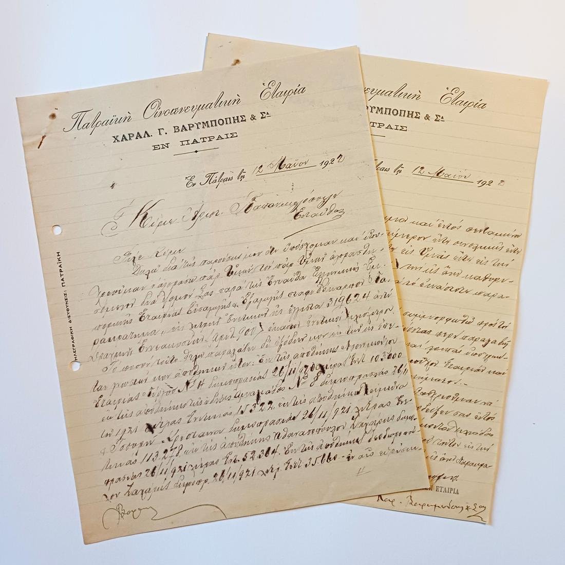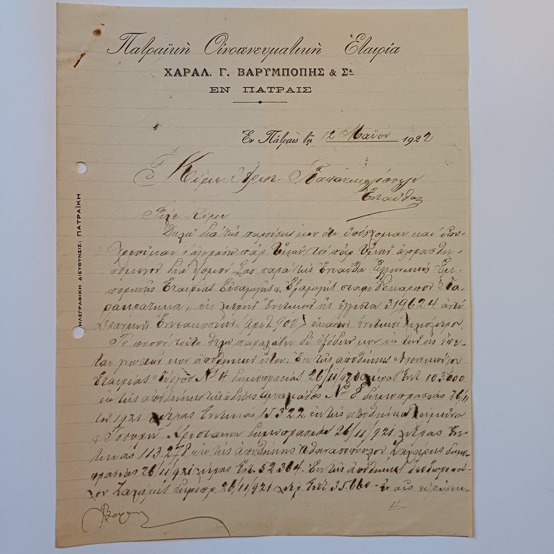 Δισέλιδη χειρόγραφη επιστολή που αποτελεί τεκμήριο της εμπορικής ιστορίας της Πάτρας, από την “Πατραϊκή Οινοπνευματική Εταιρία” των Χαράλαμπου Γ. Βαρυμπόμπη & Σία. Με ημερομηνία 12 Μαΐου 1922.