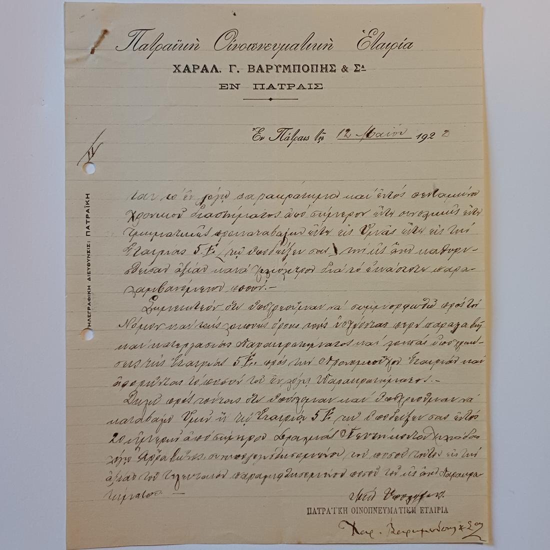 Δισέλιδη χειρόγραφη επιστολή που αποτελεί τεκμήριο της εμπορικής ιστορίας της Πάτρας, από την “Πατραϊκή Οινοπνευματική Εταιρία” των Χαράλαμπου Γ. Βαρυμπόμπη & Σία. Με ημερομηνία 12 Μαΐου 1922, η επιστολή αυτή γράφτηκε σε μια κομβική ιστορική στιγμή για την Ελλάδα, λίγους μήνες πριν από τη Μικρασιατική Καταστροφή, και αντανακλά την άνθιση του εμπορίου οίνου και οινοπνεύματος στην Αχαΐα κατά τον Μεσοπόλεμο. Η εταιρεία αποτελούσε μέρος του δικτύου οινοποιιών της περιοχής, οι οποίες αξιοποιούσαν τις ονομαστές ποικιλίες της Πάτρας, όπως η Μαυροδάφνη και το Μοσχάτο, για την παραγωγή διεθνώς αναγνωρισμένων προϊόντων.