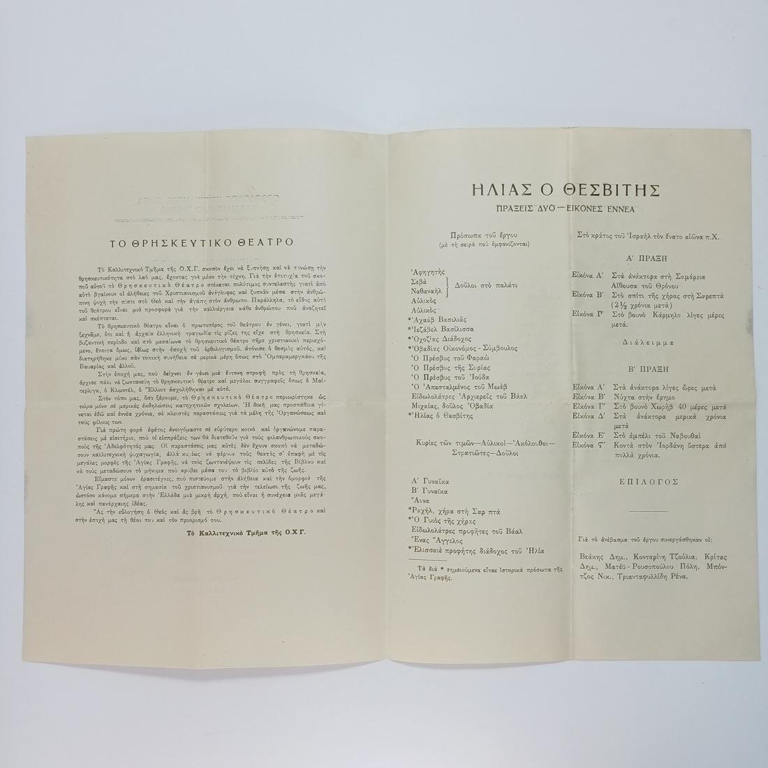 Δίπτυχο πρόγραμμα της θεατρικής παράστασης “Ηλίας ο Θεσβίτης”, ενός θρησκευτικού δράματος που παρουσιάστηκε στις 24 Μαΐου 1958 στο ιστορικό Θέατρο Ιντεάλ της Αθήνας