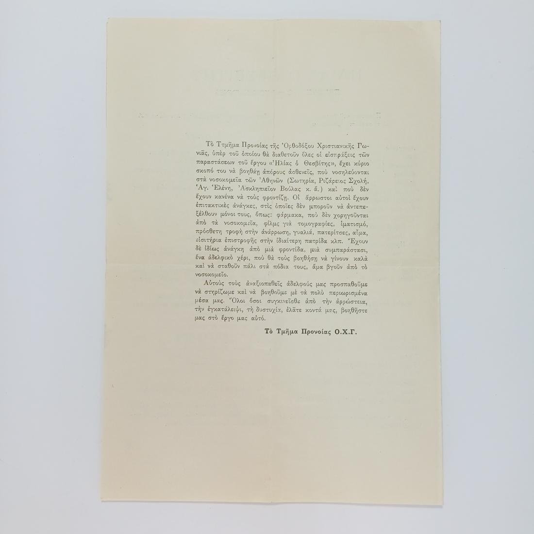 Δίπτυχο πρόγραμμα της θεατρικής παράστασης “Ηλίας ο Θεσβίτης”, ενός θρησκευτικού δράματος που παρουσιάστηκε στις 24 Μαΐου 1958 στο ιστορικό Θέατρο Ιντεάλ της Αθήνας. Το έργο γράφτηκε από τη Ρένα Τριανταφυλλίδη, μια συγγραφέα με παρουσία στον χώρο του χριστιανικού και παιδικού θεάτρου κατά τη δεκαετία του ’50 και του ’60, η οποία έχει εκδώσει και άλλα σχετικά έργα, όπως το «Παιδικό Χριστουγεννιάτικο Θέατρο». Η παραγωγή διοργανώθηκε από το Καλλιτεχνικό Τμήμα της «Ορθόδοξης Χριστιανικής Γωνιάς», ενός σωματείου που την εποχή εκείνη χρησιμοποιούσε το θέατρο ως μέσο θρησκευτικής και ηθικής αγωγής.