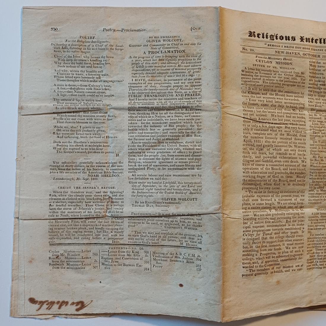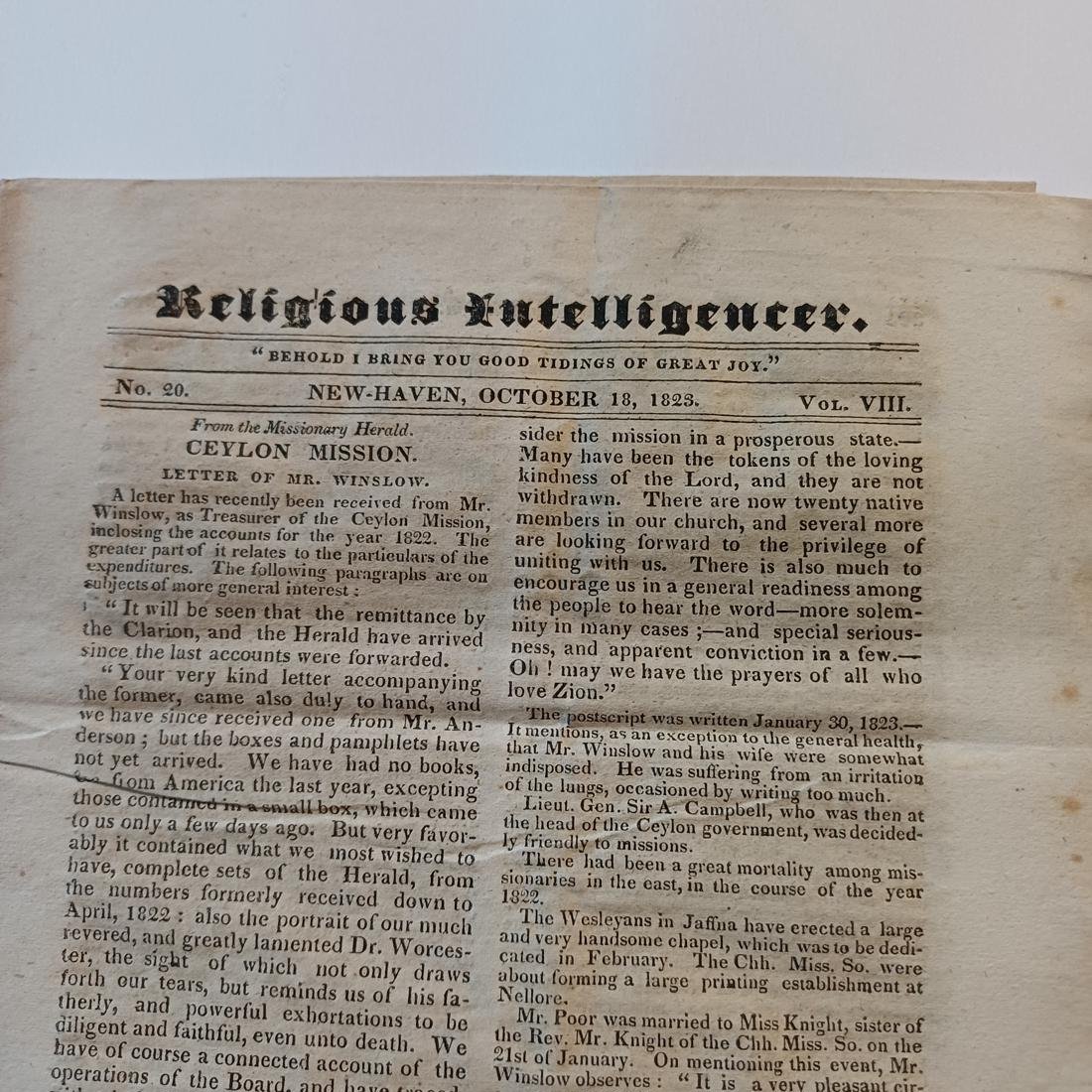 Εβδομαδιαία εφημερίδα “Religious Intelligencer”, εκδιδόταν στο New Haven του Κονέκτικατ, No. 20, Vol. VIII, με ημερομηνία κυκλοφορίας 18 Οκτωβρίου 1823. Η εφημερίδα αυτή αποτελούσε από τις σημαντικότερες πηγές θρησκευτικών ειδήσεων της εποχής στις ΗΠΑ, εστιάζοντας κυρίως στη δράση των προτεσταντικών ιεραποστολών παγκοσμίως. Δεσπόζει η βιβλική φράση “Behold I bring you good tidings of great joy” (Ιδού, σας φέρω χαρμόσυνα νέα μεγάλης χαράς) και περιλαμβάνει εκτενείς ανταποκρίσεις από την Ιεραποστολή της Κεϋλάνης (σημερινή Σρι Λάνκα) και την Ιεραποστολή της Βομβάης. Οι επιστολές, όπως αυτή του Mr. Winslow, περιγράφουν τις προκλήσεις των ιεραποστόλων, την ίδρυση σχολείων και κολεγίων για τη διδασκαλία των τοπικών γλωσσών (όπως η Ταμίλ), καθώς και τις προσπάθειες εκτύπωσης θρησκευτικών κειμένων, όπως το Ευαγγέλιο του Ματθαίου.