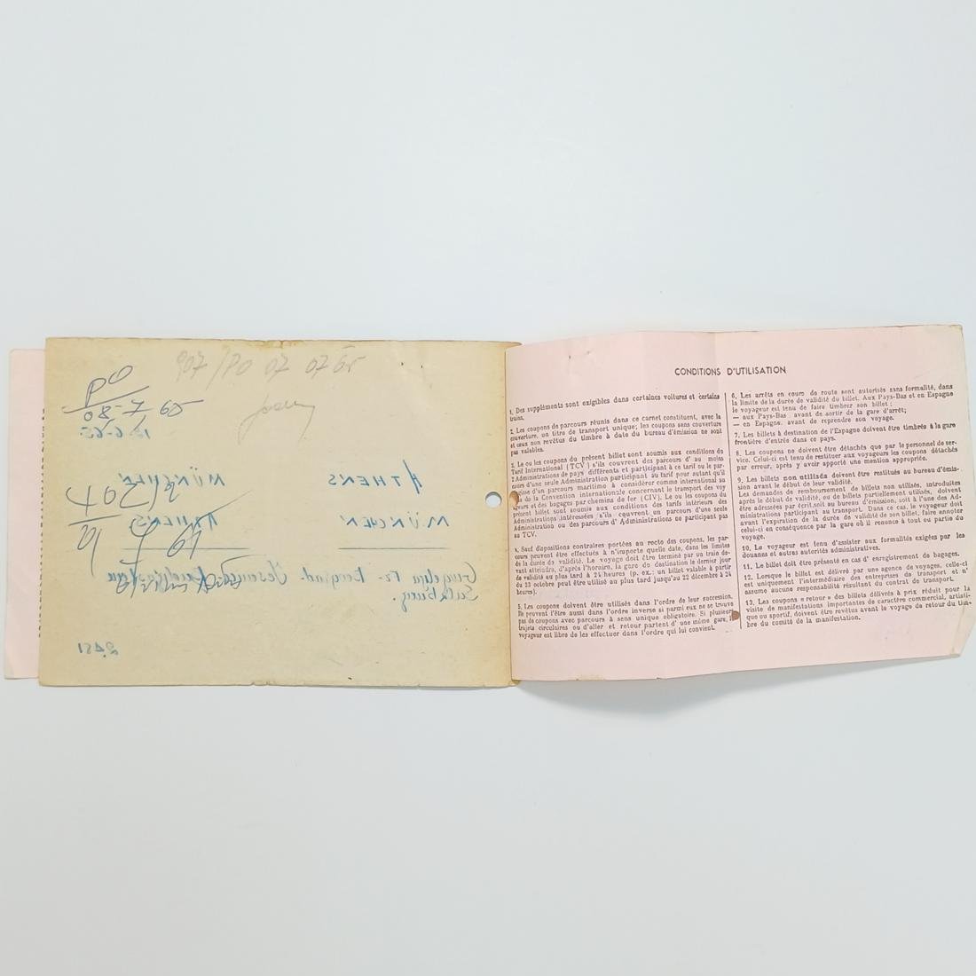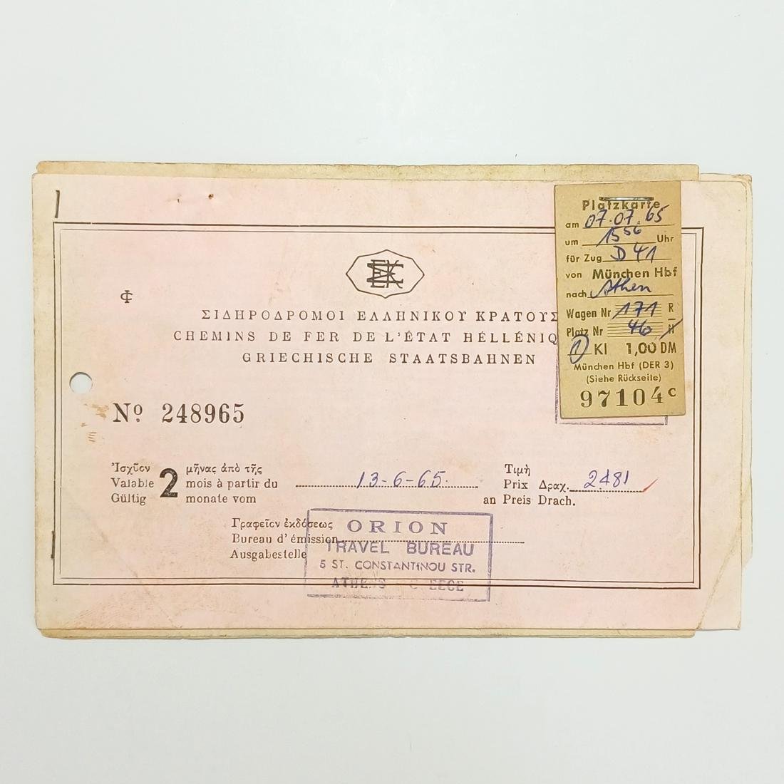 Σιδηροδρομικό εισιτήριο και κάρτα κράτησης θέσης των Σιδηροδρόμων Ελληνικού Κράτους (Σ.Ε.Κ.), που εκδόθηκε στις 13 Ιουνίου 1965. Αφορά το δρομολόγιο από το Μόναχο (München Hbf) προς την Αθήνα (Athens).