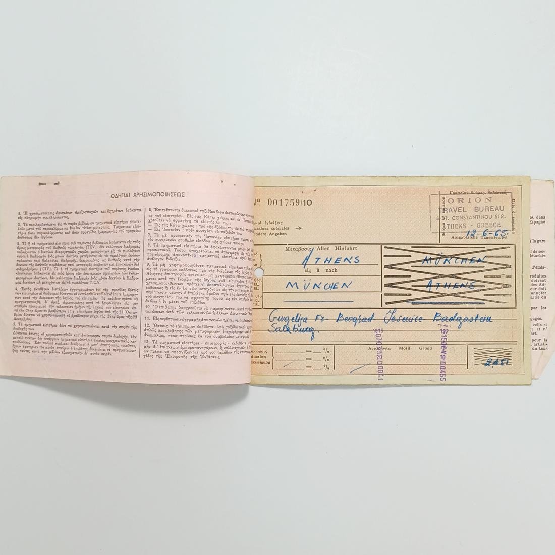 Σιδηροδρομικό εισιτήριο και κάρτα κράτησης θέσης των Σιδηροδρόμων Ελληνικού Κράτους (Σ.Ε.Κ.), που εκδόθηκε στις 13 Ιουνίου 1965. Από Μόναχο (München Hbf) προς Αθήνα (Athens).
