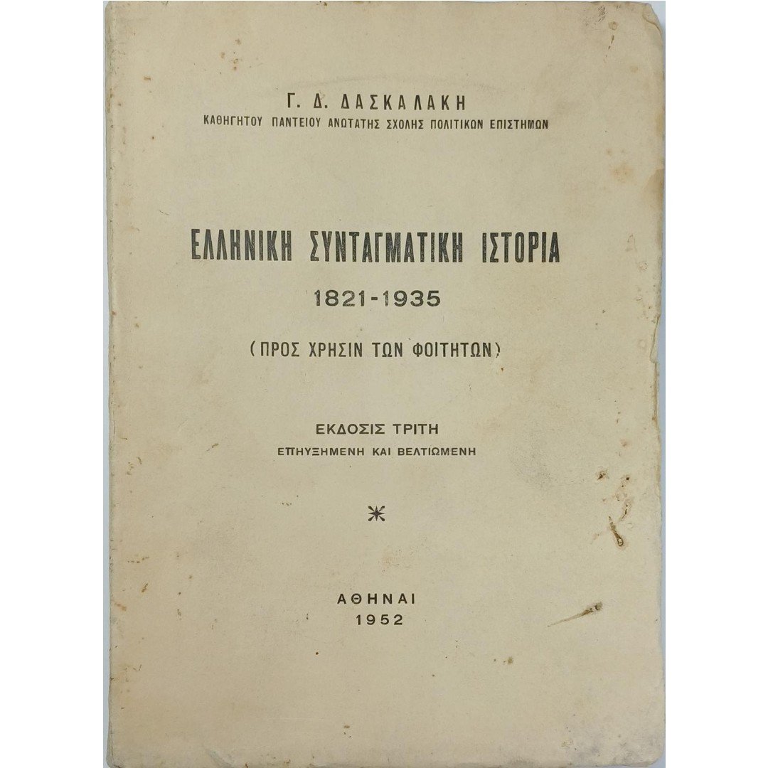 Το δυσεύρετο βιβλίο «Ελληνική Συνταγματική Ιστορία 1821-1935» του Γ. Δ. Δασκαλάκη αποτελεί σύγγραμμα που εξετάζει τη συνταγματική εξέλιξη της Ελλάδας από την έναρξη της Επανάστασης του 1821 έως το 1935. Το έργο αναλύει τη γένεση του ελληνικού συνταγματισμού, καλύπτοντας την περίοδο των τοπικών πολιτευμάτων και Συνταγμάτων κατά τη διάρκεια του απελευθερωτικού αγώνα (όπως το Σύνταγμα της Επιδαύρου), καθώς και τη μετέπειτα διαμόρφωση του κράτους και του δημοσίου δικαίου κατά τον 19ο και στις αρχές του 20ού αιώνα.