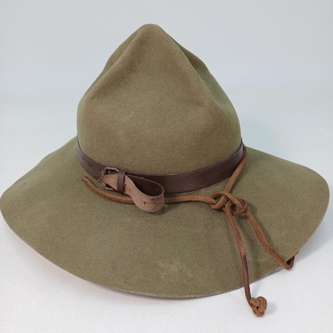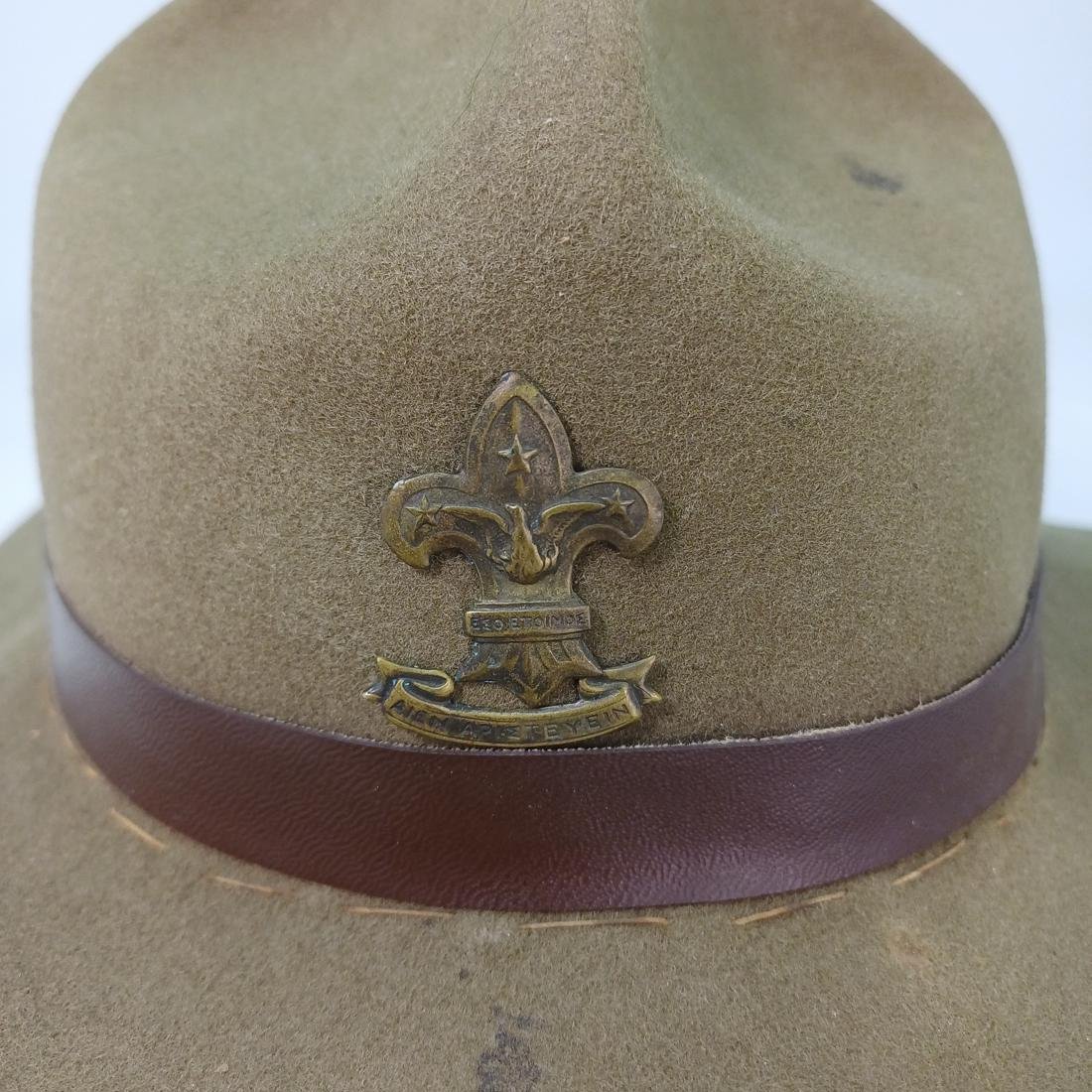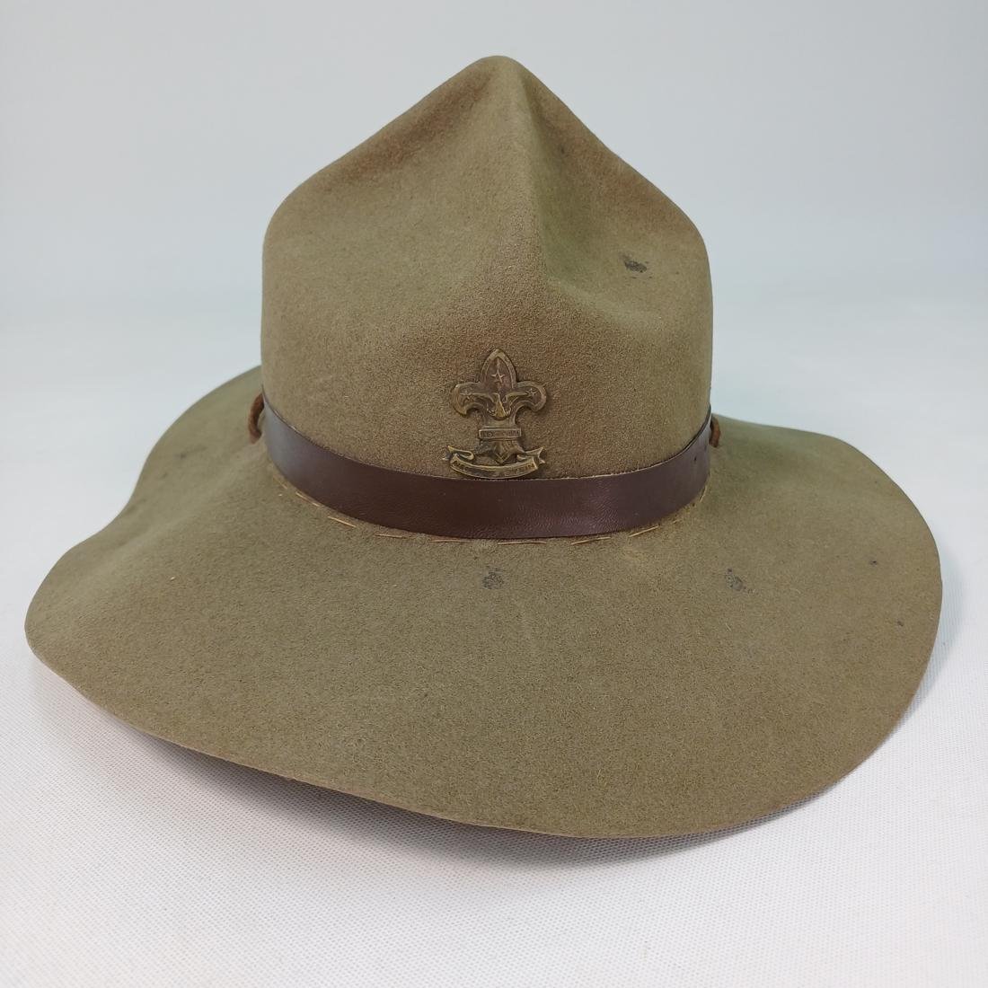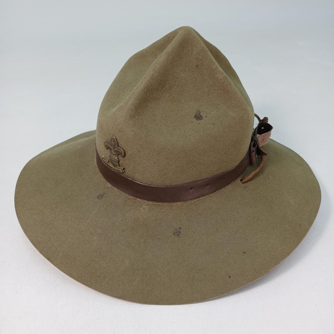 Επίσημο καπέλο των Ελλήνων Προσκόπων με ορειχάλκινο έμβλημα “fleur-de-lis”, το οποίο φέρει τις επιγραφές “ΕΣΟ ΕΤΟΙΜΟΣ” και “ΑΙΕΝ ΑΡΙΣΤΕΥΕΙΝ”. Χρονολογείται περί τη δεκαετία 1960.