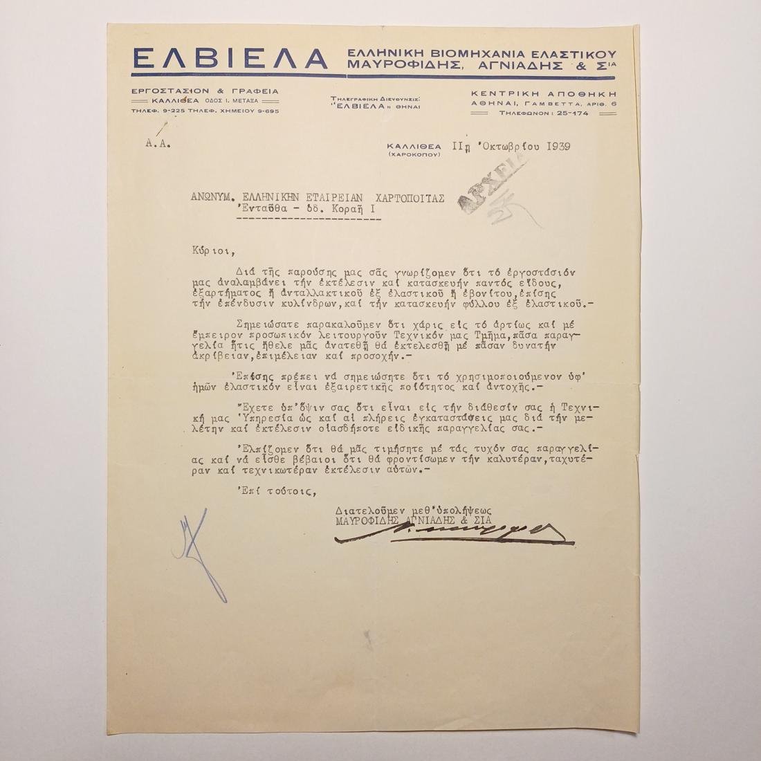Επιστολή και τρίπτυχο έντυπο που αφορούν την εταιρεία “ΕΛΒΙΕΛΑ” (Ελληνική Βιομηχανία Ελαστικού) 11-10-1939, Καλλιθέα