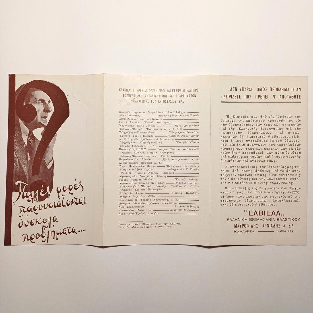 Επιστολή και τρίπτυχο έντυπο που αφορούν την εταιρεία “ΕΛΒΙΕΛΑ”. Η επιστολή με ημερομηνία 11 Οκτωβρίου 1939, απευθύνεται στην “Ανώνυμον Ελληνικήν Εταιρείαν Χαρτοποιΐας” και αναφέρεται στην εξειδίκευση του εργοστασίου στην κατασκευή εξαρτημάτων από ελαστικό ή εβονίτη, καθώς και στην επένδυση κυλίνδρων, αναδεικνύοντας τη βιομηχανική δραστηριότητα της εταιρείας πέρα από τα υποδήματα. Παρά την τεράστια επιτυχία της τις δεκαετίες του ’50 και ’60, με την παραγωγή να φτάνει τα 50.000 ζευγάρια ετησίως, η ΕΛΒΙΕΛΑ οδηγήθηκε σε οικονομικό αδιέξοδο και έκλεισε οριστικά το 1961, αφήνοντας όμως ένα ανεξίτηλο σημάδι στην ελληνική αγορά και την καθημερινότητα των Ελλήνων.