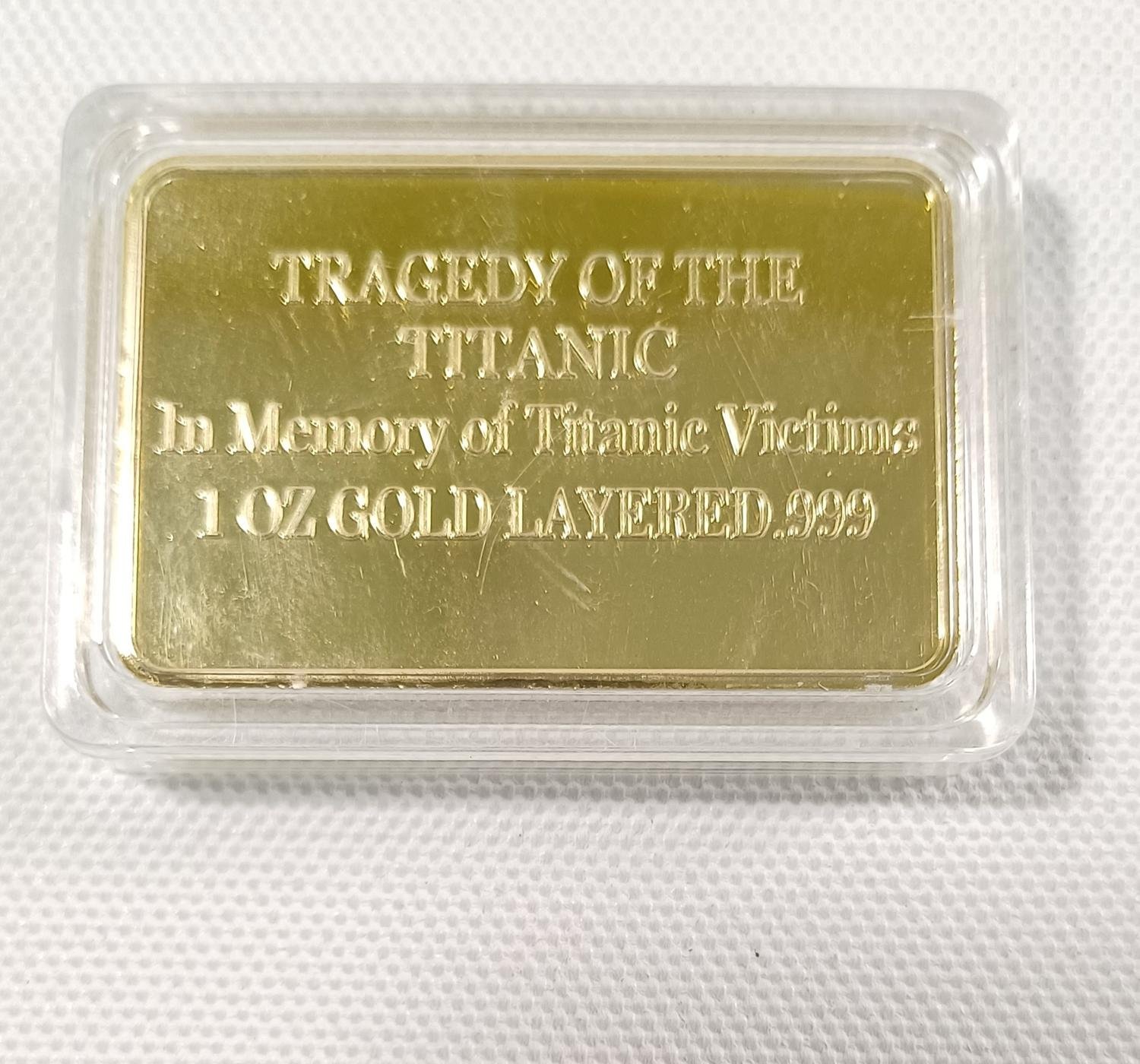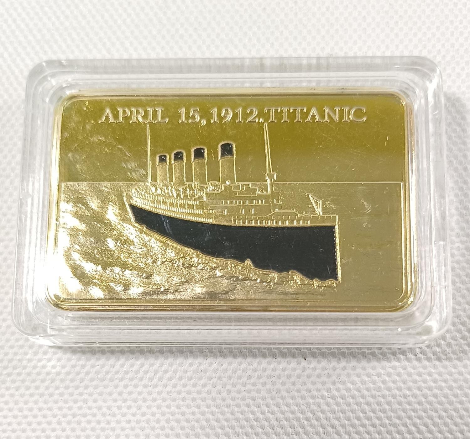Μπάρα με επίστρωση χρυσού αφιερωμένη στη μνήμη των θυμάτων του Τιτανικού. Στην μια όψη απεικονίζεται ο Τιτανικός και η ημερομηνία βύθισής του 15 Απριλίου 1912. Ο Τιτανικός ήταν ένα βρετανικό επιβατηγό πλοίο που βυθίστηκε στον Βόρειο Ατλαντικό Ωκεανό αφού χτύπησε σε ένα παγόβουνο κατά τη διάρκεια του παρθενικού του ταξιδιού από το Σαουθάμπτον στη Νέα Υόρκη.