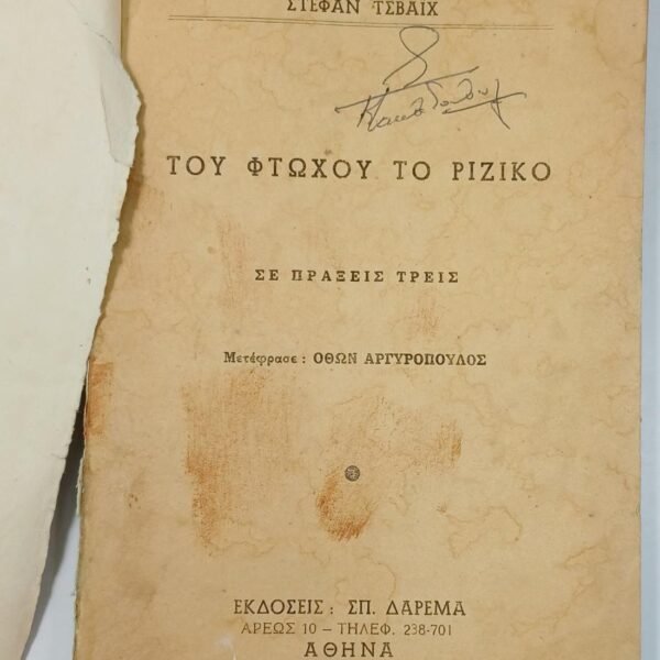 Το βιβλίο είναι μεταχειρισμένο με ορισμένη φθορά στη ράχη. Φέρει προσωπική σημείωση προηγούμενου ιδιοκτήτη.