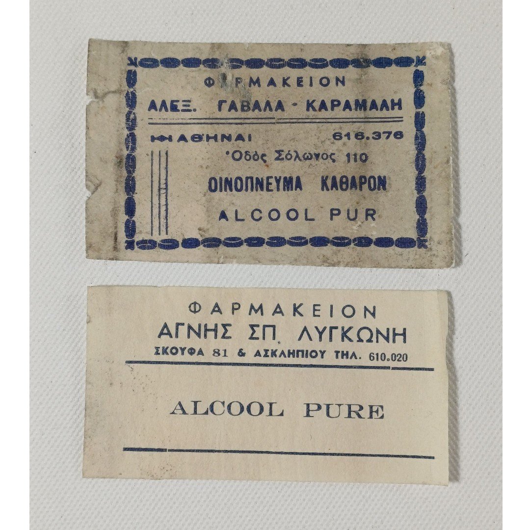 2 vintage ετικέτες φαρμακείου για οινόπνευμα