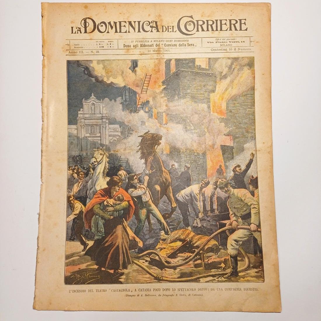 Η σπάνια 8/φυλλη εβδομαδιαία εφημερίδα “La Domenica del Corriere”, κυκλοφόρησε στις 10 Μαρτίου 1901, έτος III, αριθμός 10, στο Μιλάνο. Το λιθόγραφο εξώφυλλο είναι έργο του Achille Beltrame το οποίο απεικονίζει τη φωτιά στο Θέατρο Castagnola στην Κατάνια, η οποία ξέσπασε λίγο μετά από μια παράσταση ιππικής, στις 23 Φεβρουαρίου 1901.