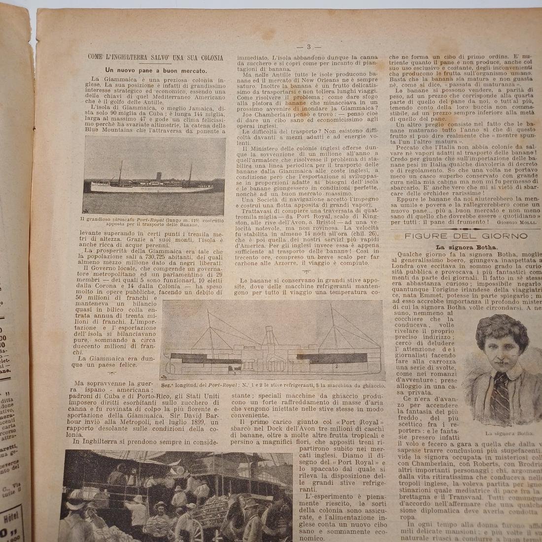 Η σπάνια 8/φυλλη εβδομαδιαία εφημερίδα “La Domenica del Corriere”, κυκλοφόρησε στις 23 Ιουνίου 1901, έτος III, αριθμός 25, στο Μιλάνο. Το λιθόγραφο εξώφυλλο είναι έργο του Achille Beltrame, τιτλοφορείται “Η αναχώρηση από το Gloucester (Ηνωμένες Πολιτείες) του καπετάνιου Blackburn με ένα ιστιοφόρο κανό για να διασχίσει τον Ατλαντικό”. Ένα από τα άρθρα της εφημερίδας, με τίτλο “COME L’INGHILTERRA SALVÒ UNA SUA COLONIA” («ΠΩΣ Η ΑΓΓΛΙΑ ΕΣΩΣΕ ΜΙΑ ΑΠΟΙΚΙΑ ΤΗΣ»), περιγράφει πώς η Τζαμάικα μεταπήδησε από την παραγωγή ζάχαρης στην παραγωγή μπανάνας μετά την αμερικανοϊσπανική σύγκρουση, η οποία κατέστησε ασύμφορες τις εξαγωγές ζάχαρης. Ένα άλλο άρθρο αναφέρει λεπτομέρειες για το πλοίο και τη διαδικασία ψύξης, ενώ στο κάτω μέρος υπάρχει ένα σύντομο άρθρο με τίτλο “ΦΙΓΟΥΡΕΣ ΤΗΣ ΗΜΕΡΑΣ” που αναφέρεται στη μυστηριώδη επίσκεψη της κυρίας Botha (σύζυγος του στρατηγού των Μπόερς) στο Λονδίνο εν μέσω του πολέμου των Μπόερς.