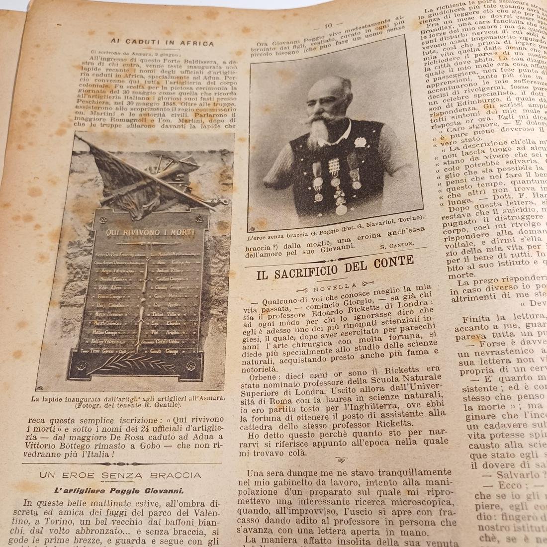 Η 8/φυλλη εβδομαδιαία εφημερίδα “La Domenica del Corriere”, κυκλοφόρησε στις 30 Ιουνίου 1901, έτος III, αριθμό 26, στο Μιλάνο. Το λιθόγραφο εξώφυλλο είναι έργο του Achille Beltrame, απεικονίζει ένα περιστατικό με τίτλο «L’Avventura Di Un Pallone Militare Trattenuto A Forza Nel Giardino D’Una Villa Presso Roma» (Η περιπέτεια ενός στρατιωτικού αερόστατου που συγκρατείται με δύναμη στον κήπο μιας βίλας κοντά στη Ρώμη). Ένα από τα άρθρα είναι για τους πεσόντες αξιωματικούς του πυροβολικού στην Αδουα (Adua) και για τον βετεράνο του Risorgimento, Τζιοβάνι Πότζιο (Giovanni Poggio). Ένα άλλο άρθρο φέρει ένα απόσπασμα από τη νουβέλα “Η θυσία του Κόμη Νοβέλα” με αναφορά σε έναν Άγγλο επιστήμονα.