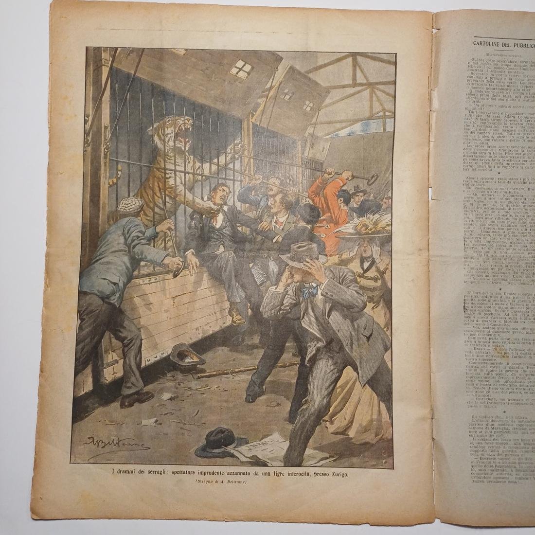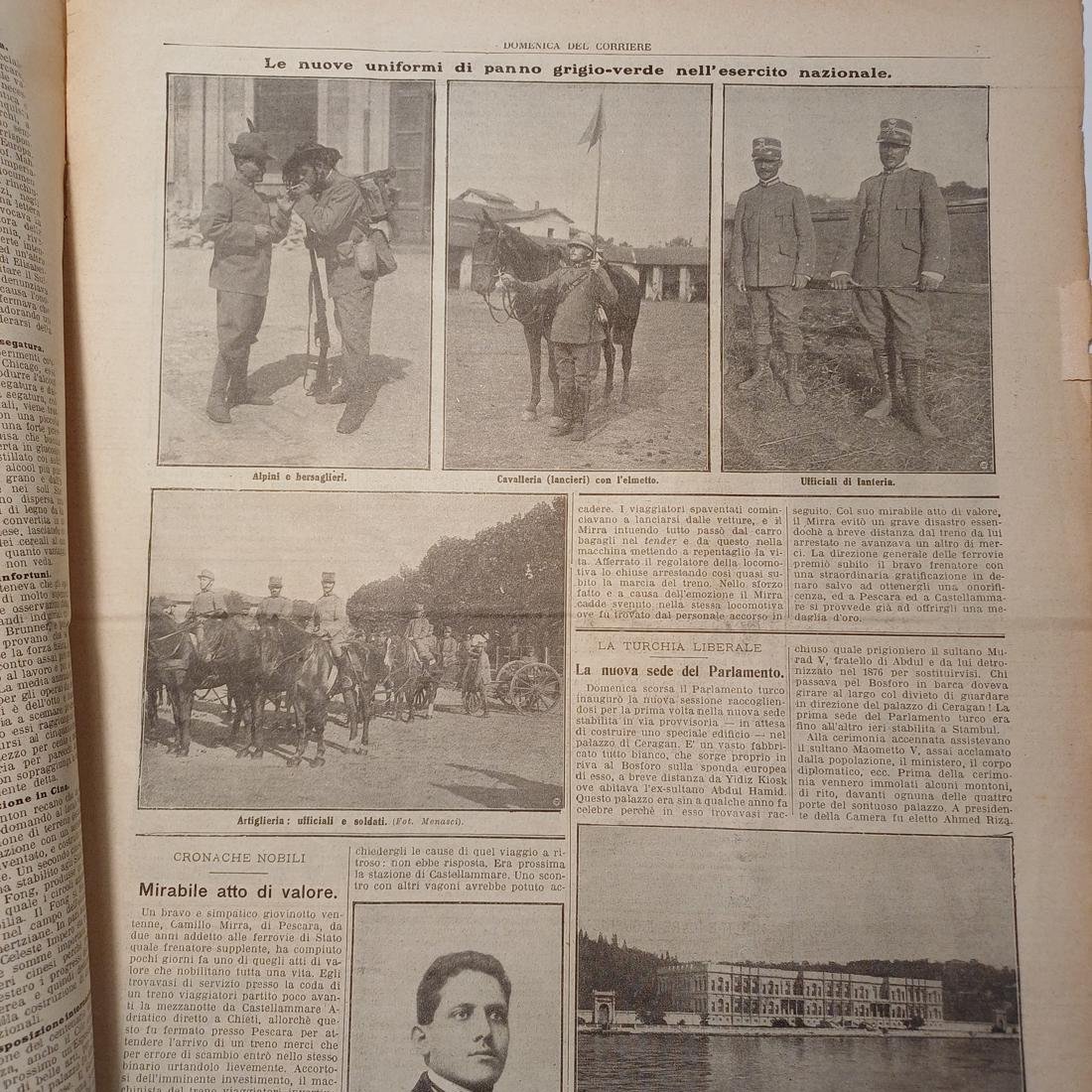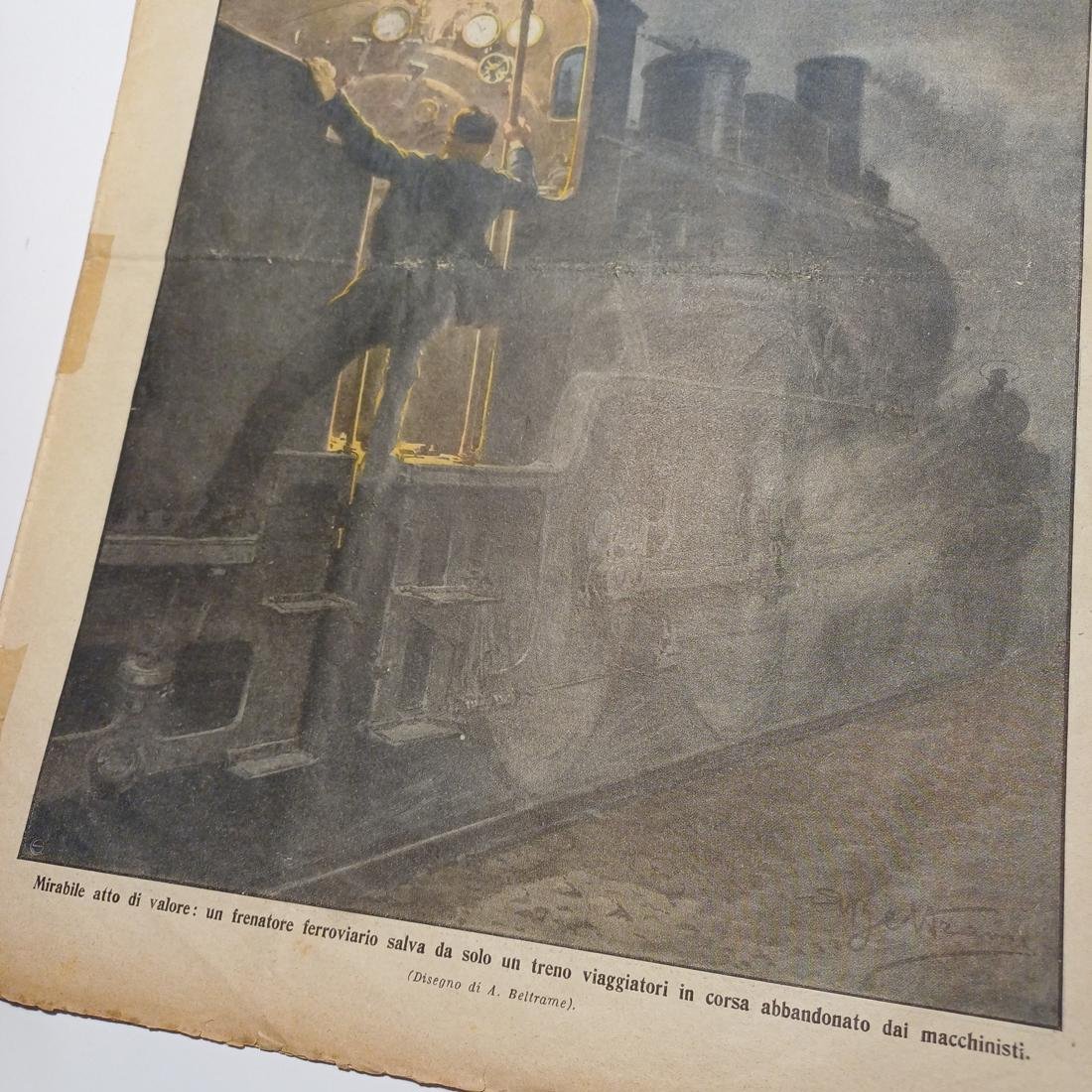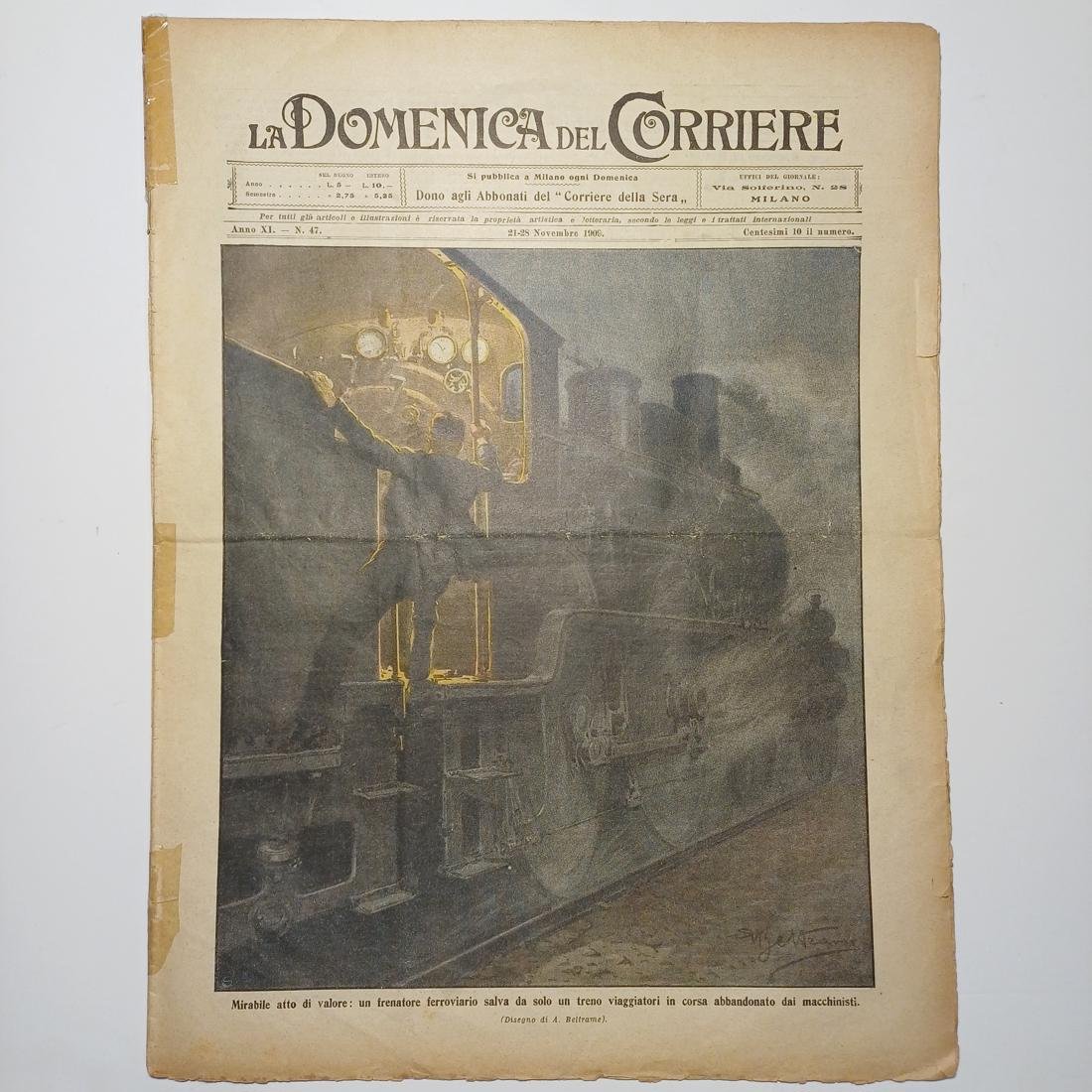 Η σπάνια λιθόγραφη 10/φυλλη εβδομαδιαία εφημερίδα “La Domenica del Corriere”, κυκλοφόρησε 21-28 Νοεμβρίου 1909, αντιστοιχεί στο έτος XI, αριθμός 47, στο Μιλάνο. Το εξώφυλλο είναι μια εικονογράφηση του Achille Beltrame “Mirabile atto di valore: un frenatore ferroviario salva da solo un treno viaggiatori in corsa abbandonato dai macchinisti” (Αξιοθαύμαστη πράξη ανδρείας: ένας σιδηροδρομικός τροχοπέδης σώζει μόνος του ένα επιβατικό τρένο εν κινήσει που εγκατέλειψαν οι μηχανοδηγοί). Περιλαμβάνει άρθρα “Alpini e bersaglieri” (Αλπινιστές και κυνηγοί), “Cavalleria (lancieri) con l’elmetto” (Ιππικό (λογχοφόροι) με το κράνος),