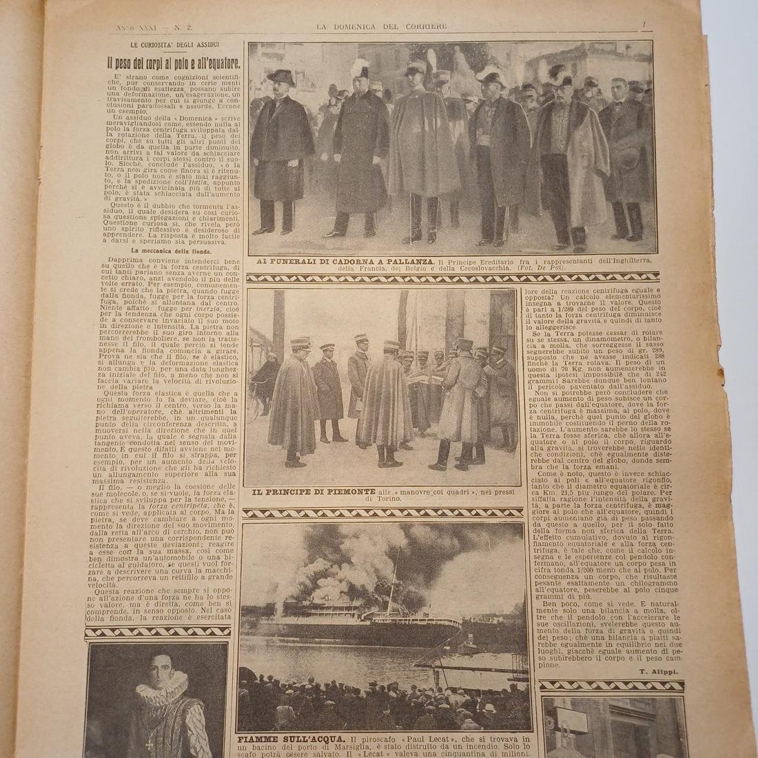 Η σπάνια 8/φυλλη εβδομαδιαία εφημερίδα “La Domenica del Corriere”, κυκλοφόρησε στις 13 Ιανουαρίου 1929-VII, έτος XXXI, αριθμό 2, στο Μιλάνο. Το λιθόγραφο εξώφυλλο είναι έργο του Achille Beltrame με τίτλο “La morte sotterra”, το οποίο απεικονίζει μια δραματική σκηνή διάσωσης σε μια πλημμυρισμένη μεταλλευτική στοά, όπου 14 αυτόχθονες μεταλλωρύχοι πνίγηκαν σε ένα ορυχείο αμιάντου στο Σινμπάνι της Ροδεσίας (σημερινή Ζιμπάμπουε), έπειτα από μια καταρρακτώδη νεροποντή που προκάλεσε πλημμύρα, παρά τις προσπάθειες άντλησης των υδάτων, με μόνο έναν Ευρωπαίο επιστάτη να σώζεται. Ένα από τα άρθρα είναι ένα επιστημονικό κείμενο με τίτλο «Το βάρος των σωμάτων στον πόλο και στον ισημερινό» που εξηγεί τις επιδράσεις της φυγόκεντρης δύναμης και του σχήματος της Γης στο βάρος των αντικειμένων. Άλλα άρθρα περιγράφουν τους στρατιωτικούς αντιπροσώπους στην κηδεία του Ιταλού Στρατάρχη Luigi Cadorna στην Παλλάντσα, μια εικόνα του Πρίγκιπα του Πεδεμοντίου κατά τη διάρκεια στρατιωτικών ελιγμών κοντά στο Τορίνο, και ένα άρθρο σχετικά με την πυρκαγιά και την καταστροφή του πλοίου “Paul Lecat” στο λιμάνι της Μασσαλίας.
