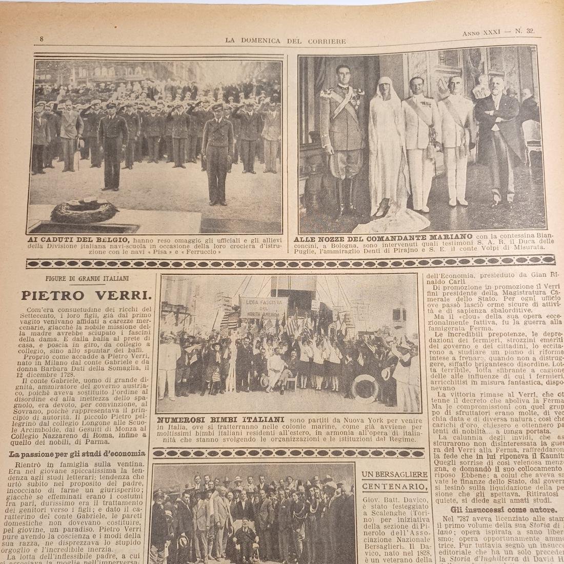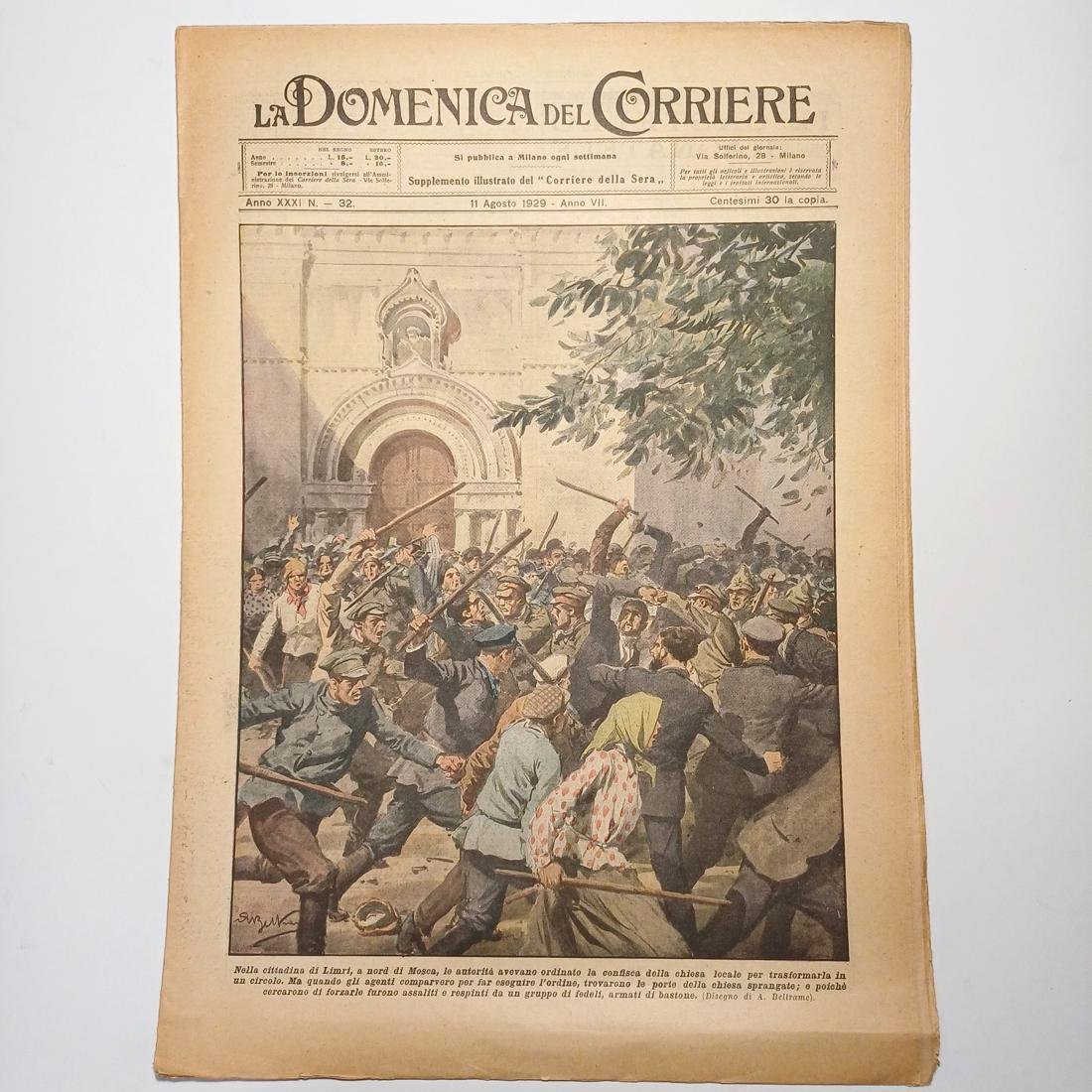 Η σπάνια 8/φυλλη εβδομαδιαία εφημερίδα “La Domenica del Corriere”, κυκλοφόρησε στις 11 Αυγούστου 1929-VII, έτος XXXI, αριθμός 32, στο Μιλάνο. Το λιθόγραφο εξώφυλλο είναι έργο του Achille Beltrame, το οποίο απεικονίζει ένα βίαιο περιστατικό στη Ρωσία με τη λεζάντα: «Στην πόλη Λίμρι, βόρεια της Μόσχας, οι αρχές είχαν διατάξει τη δήμευση της τοπικής εκκλησίας για να τη μετατρέψουν σε λέσχη, αλλά όταν οι πράκτορες εμφανίστηκαν για να εκτελέσουν τη διαταγή, βρήκαν τις πόρτες της εκκλησίας σφραγισμένες, και επειδή προσπάθησαν να τις παραβιάσουν, δέχτηκαν επίθεση και απωθήθηκαν από μια ομάδα πιστών οπλισμένους με μπαστούνια». Ένα από τα άρθρα ξεκινά με τον φόρο τιμής που απέτιναν Ιταλοί ναυτικοί αξιωματικοί και μαθητές στους πεσόντες του Βελγίου, καθώς και λεπτομέρειες για τον γάμο του κομαντάντε Μαριάνο στη Μπολόνια, στον οποίο παρευρέθηκαν σημαντικά πρόσωπα. Ένα άλλο άρθρο καλύπτει την άφιξη Ιταλών παιδιών από τη Νέα Υόρκη σε παραθαλάσσιες αποικίες στην Ιταλία, ως μέρος πρωτοβουλιών του Καθεστώτος. Το κύριο μέρος της σελίδας είναι αφιερωμένο στη βιογραφία του Πετρέ Βέρρι, ενός διακεκριμένου οικονομολόγου και προέδρου του Εμπορικού Δικαστηρίου που πολέμησε τη φορολογία “Ferme”.