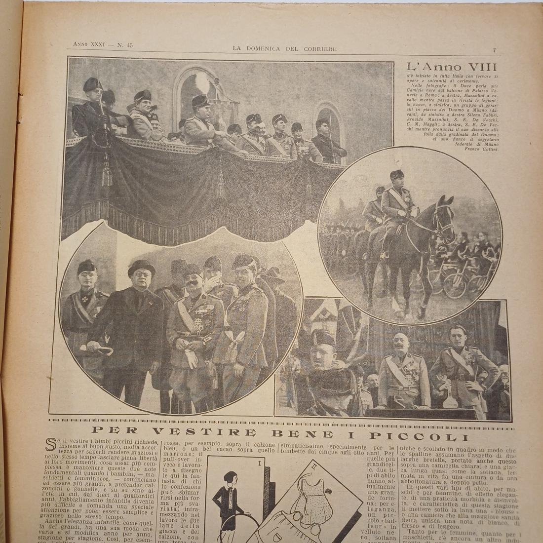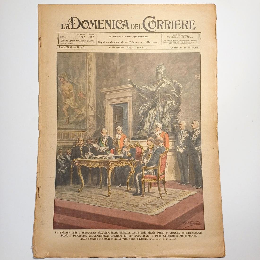 Η 8/φυλλη εβδομαδιαία εφημερίδα “La Domenica del Corriere”, κυκλοφόρησε στις 10 Νοεμβρίου 1929-VIII, έτος XXXI, αριθμό 45, στο Μιλάνο. Το λιθόγραφο εξώφυλλο είναι έργο του Achille Beltrame το οποίο απεικονίζει τη σοβαρή εναρκτήρια συνεδρίαση της Ακαδημίας της Ιταλίας (Accademia d’Italia) και δείχνει τη σκηνή να λαμβάνει χώρα στην Αίθουσα των Ορατίων και Κουριατίων στο Καπιτώλιο της Ρώμης. Διακρίνονται ο πρόεδρος της Ακαδημίας, γερουσιαστής Tommaso Tittoni, να μιλάει, και ο Μπενίτο Μουσολίνι, αναφερόμενος ως “Il Duce”, ο οποίος εκθείασε τη σημασία των επιστημών και της τέχνης. Περιλαμβάνει άρθρο με τίτλο «L’Anno VIII» που περιγράφει την έναρξη του όγδοου έτους της φασιστικής εποχής σε όλη την Ιταλία με επίσημες τελετές. Οι φωτογραφίες δείχνουν τον Μπενίτο Μουσολίνι να μιλάει από το μπαλκόνι του Palazzo Venezia στη Ρώμη, και άλλους αξιωματούχους σε διάφορες εκδηλώσεις.