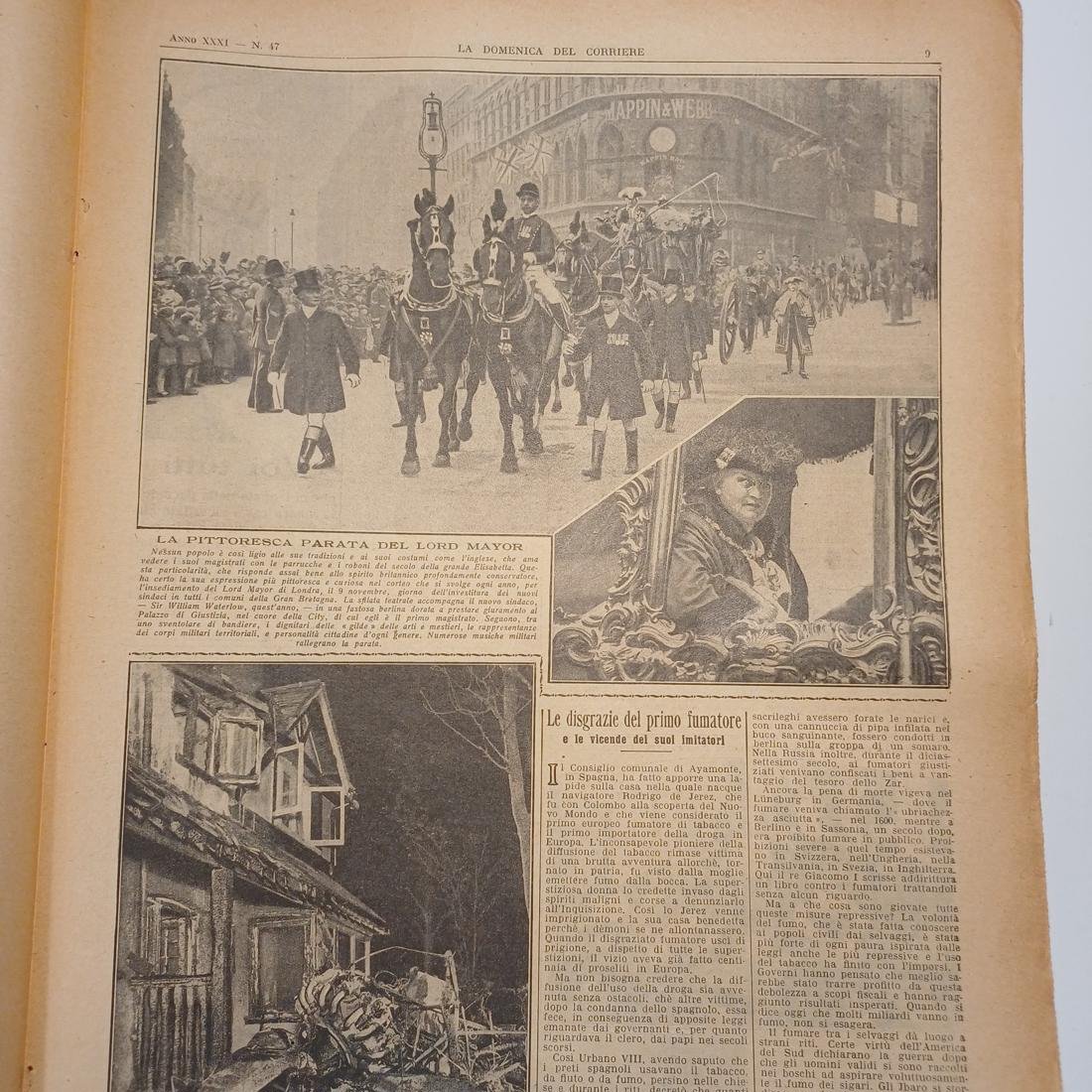 Η σπάνια 8/φυλλη εβδομαδιαία εφημερίδα “La Domenica del Corriere”, κυκλοφόρησε στις 24 Νοεμβρίου 1929-VIII, έτος XXXI, αριθμό 47, στο Μιλάνο. Το εξώφυλλο είναι έργο του Achille Beltrame που απεικονίζει εργάτες μέσα στη μεγάλη σήραγγα των Απεννίνων (Galleria dell’Appennino tosco-emiliano) και αναφέρει ότι οι γεωτρήσεις έχουν ήδη διαπεράσει το τελευταίο διάφραγμα της σήραγγας μήκους 18,5 χιλιομέτρων, μεταξύ των ποταμών Setta και Bisenzio, και οι φωνές των ανθρακωρύχων γίνονται αντιληπτές και από τις δύο πλευρές. Ένα από τα άρθρα περιγράφει τη γραφική ετήσια παρέλαση του Λόρδου Δημάρχου του Λονδίνου, Γουίλιαμ Γουόριοου, με άρματα και στρατιωτικά σώματα, ενώ το ένα άλλο αφηγείται την ιστορία του Ροδρίγο ντε Χερέθ, του πρώτου Ευρωπαίου καπνιστή που ανακάλυψε τον καπνό με τον Κολόμβο, ο οποίος φυλακίστηκε από την Ιερά Εξέταση επειδή η σύζυγός του νόμιζε ότι είχε κυριευθεί από δαίμονες όταν τον είδε να βγάζει καπνό από το στόμα.