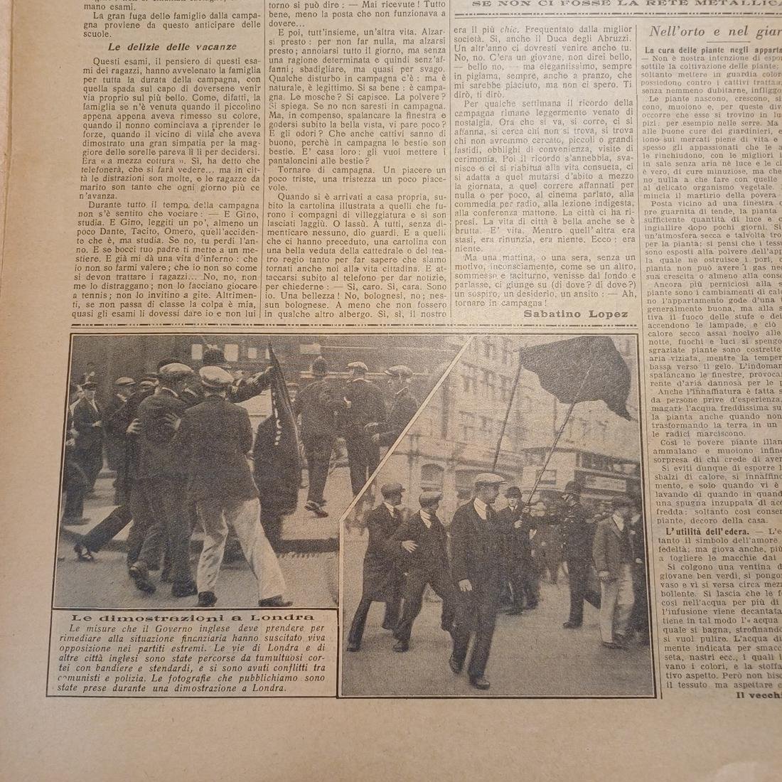 Η σπάνια 8/φυλλη εβδομαδιαία εφημερίδα “La Domenica del Corriere”, κυκλοφόρησε στις 18 Οκτωβρίου 1931-IX, έτος XXXIII, αριθμός 42, στο Μιλάνο. Το λιθόγραφο εξώφυλλο είναι έργο του Achille Beltrame, το οποίο απεικονίζει ένα γεγονός στη Somma Vesuviana της Ιταλίας, όπου ένας ιδιοκτήτης αμπελώνα δείπνησε με την οικογένειά του όταν μια τρομακτική έκρηξη έσκισε το ταβάνι και προκάλεσε πυρκαγιά στο σπίτι. Η αιτία ήταν ένας αυτοσχέδιος εκρηκτικός μηχανισμός που εκτοξεύτηκε στη στέγη από έναν κλέφτη σταφυλιών που είχε καταγγείλει ο ιδιοκτήτης, αλλά όλοι κατάφεραν να διαφύγουν. Ένα από τα άρθρα τη εφημερίδας, περιλαμβάνει δύο μέρη: το πρώτο, με τίτλο «Οι απολαύσεις των διακοπών» από τον Sabatino Lopez, περιγράφει τη νοσταλγία της εξοχής, τις οικογενειακές ανησυχίες για τις εξετάσεις και την επιστροφή στην πόλη. Το δεύτερο μέρος, με τίτλο «Οι διαδηλώσεις στο Λονδίνο», αναφέρει τις σφοδρές αντιδράσεις, τις χαοτικές πορείες και τις συγκρούσεις μεταξύ κομμουνιστών και αστυνομίας στο Λονδίνο και σε άλλες αγγλικές πόλεις, λόγω των οικονομικών μέτρων της βρετανικής κυβέρνησης, με τη φωτογραφία να απεικονίζει μία από αυτές τις διαδηλώσεις.