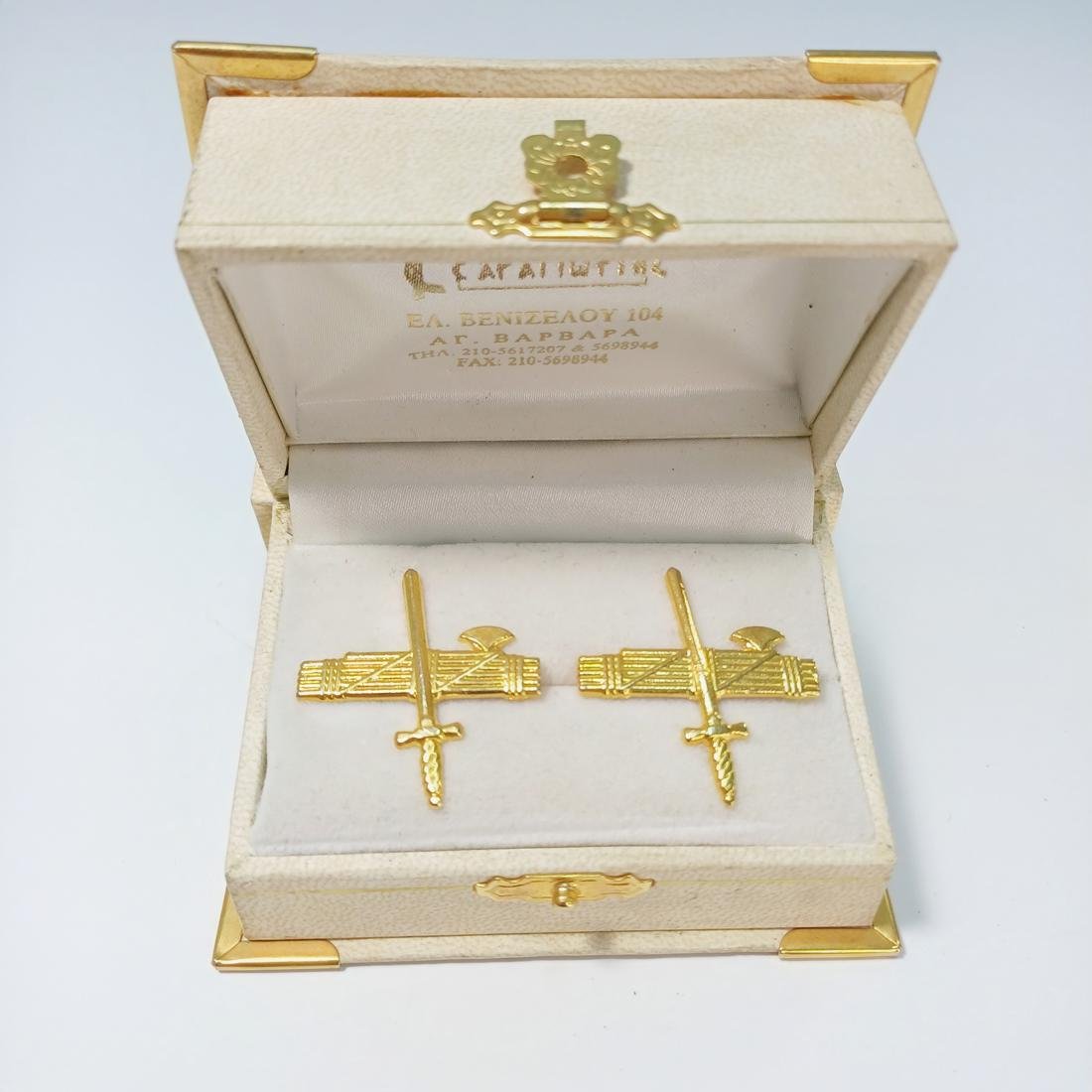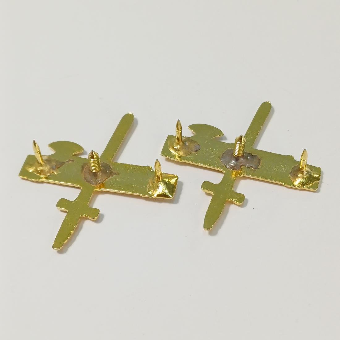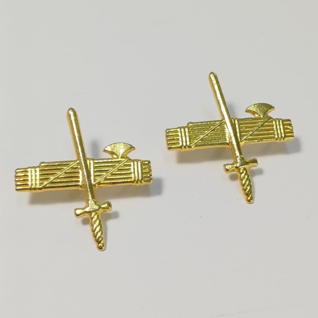 Εμβλήματα πέτου (insignias) της Ισπανικής Πολιτικής Φρουράς (Guardia Civil), προορίζονται για την επίσημη στολή ή το πουκάμισο των αξιωματικών του σώματος. Φέρουν τον παραδοσιακό συμβολισμό του σώματος: ένα ξίφος και μια δέσμη ράβδων με πέλεκυ (fasces) που διασταυρώνονται. Με την ισπανική στρατιωτική παράδοση, το ξίφος συμβολίζει την υποταγή της δύναμης στη νόμιμη εξουσία, ενώ οι ράβδοι (haz de lictores) αντιπροσωπεύουν την τάξη και την ικανότητα του κράτους να επιβάλλει τον νόμο. Κατασκευασμένα από μεταλλικό κράμα σε χρυσό χρώμα.