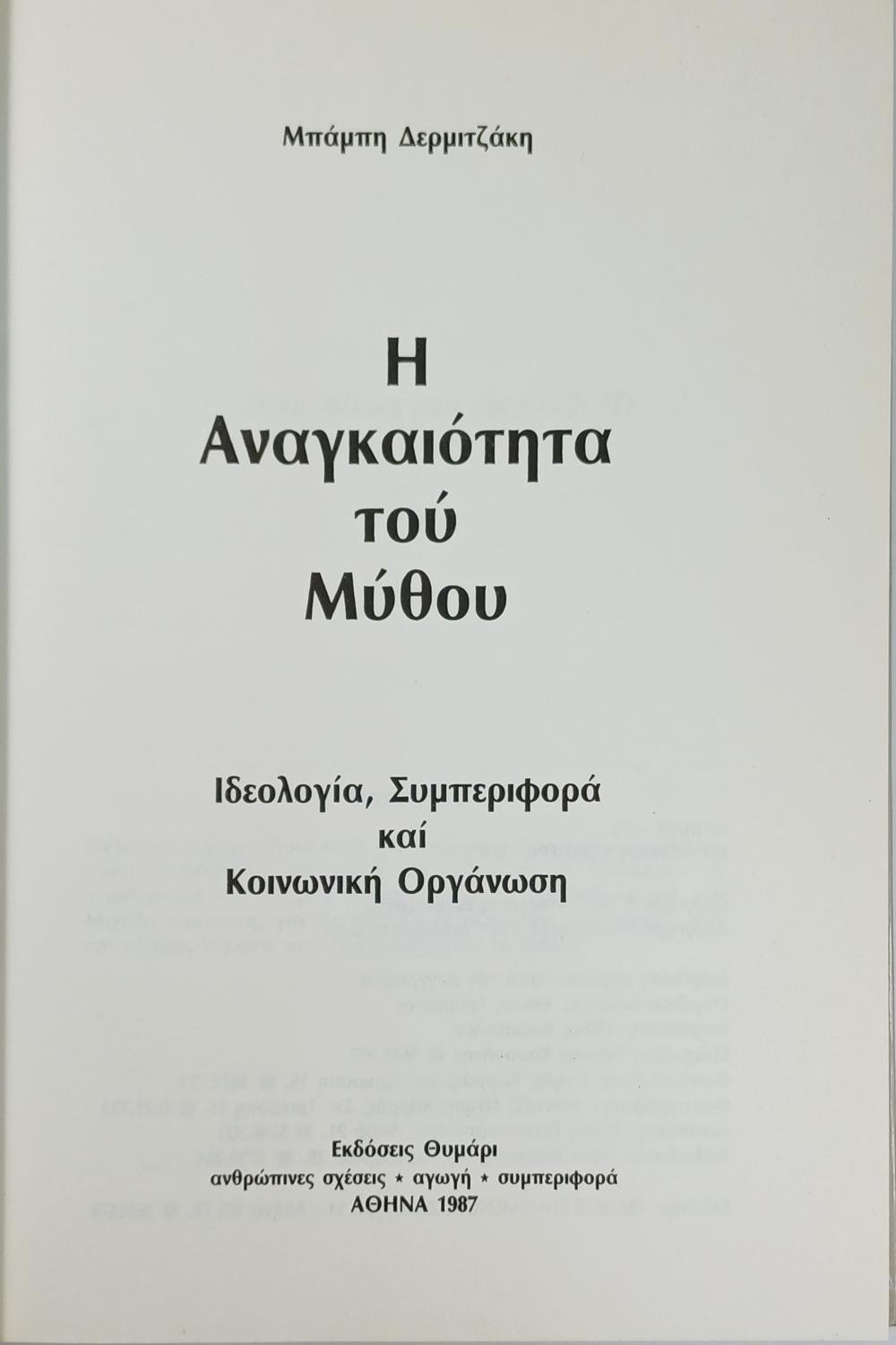 Το βιβλίο του Μπάμπη Δερμιτζάκη “Η αναγκαιότητα του μύθου” διερευνά τον κεντρικό ρόλο που διαδραματίζει το ψέμα ή ο μύθος στην ανθρώπινη ύπαρξη, τόσο σε ατομικό όσο και σε κοινωνικό επίπεδο. Σύμφωνα με την παρουσίαση του βιβλίου, όλοι χρησιμοποιούμε ασυνείδητα μύθους για να δικαιολογηθούμε, να νιώσουμε ασφάλεια και να παρηγορηθούμε. Ο συγγραφέας αναλύει τους μηχανισμούς δημιουργίας αυτών των μύθων και πώς αυτοί επηρεάζουν τη συνολική ιδεολογία, τη συμπεριφορά και την οργάνωση της κοινωνίας, με στόχο να βοηθήσει τους αναγνώστες να κατανοήσουν και να υπερβούν τους δικούς τους προσωπικούς ή εποχικούς μύθους.